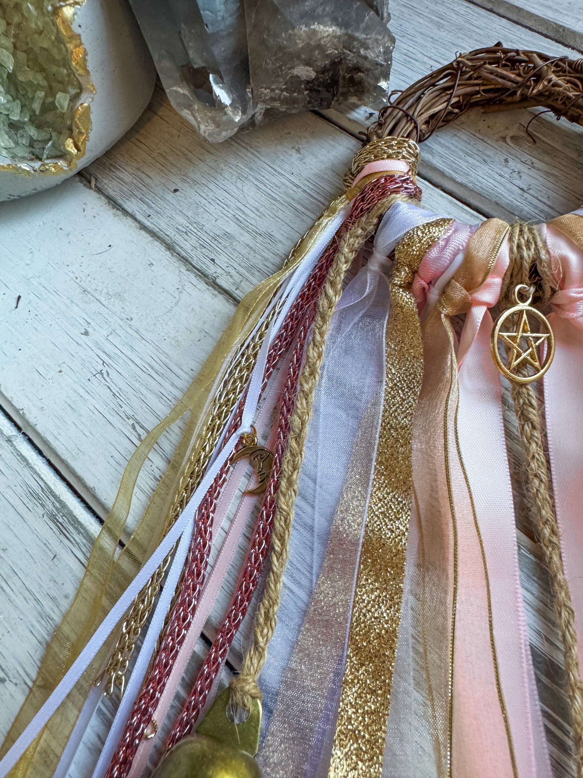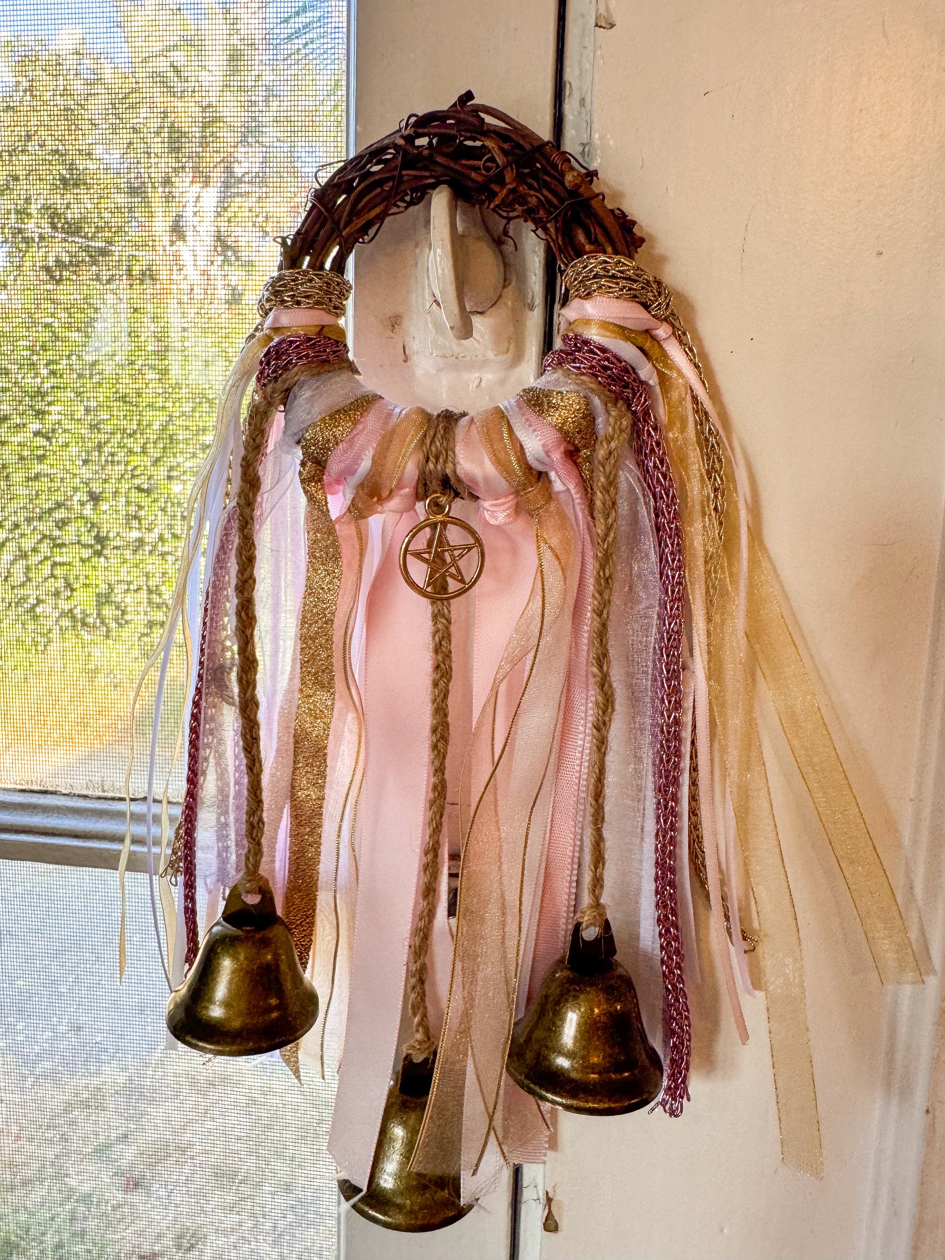 Delicate ribbons in blush, gold, and ivory shimmer like the first light of dawn, with a golden pentacle at its heart for protection and harmony. This witch bell radiates warmth, joy, and a gentle blessing over any space it graces.