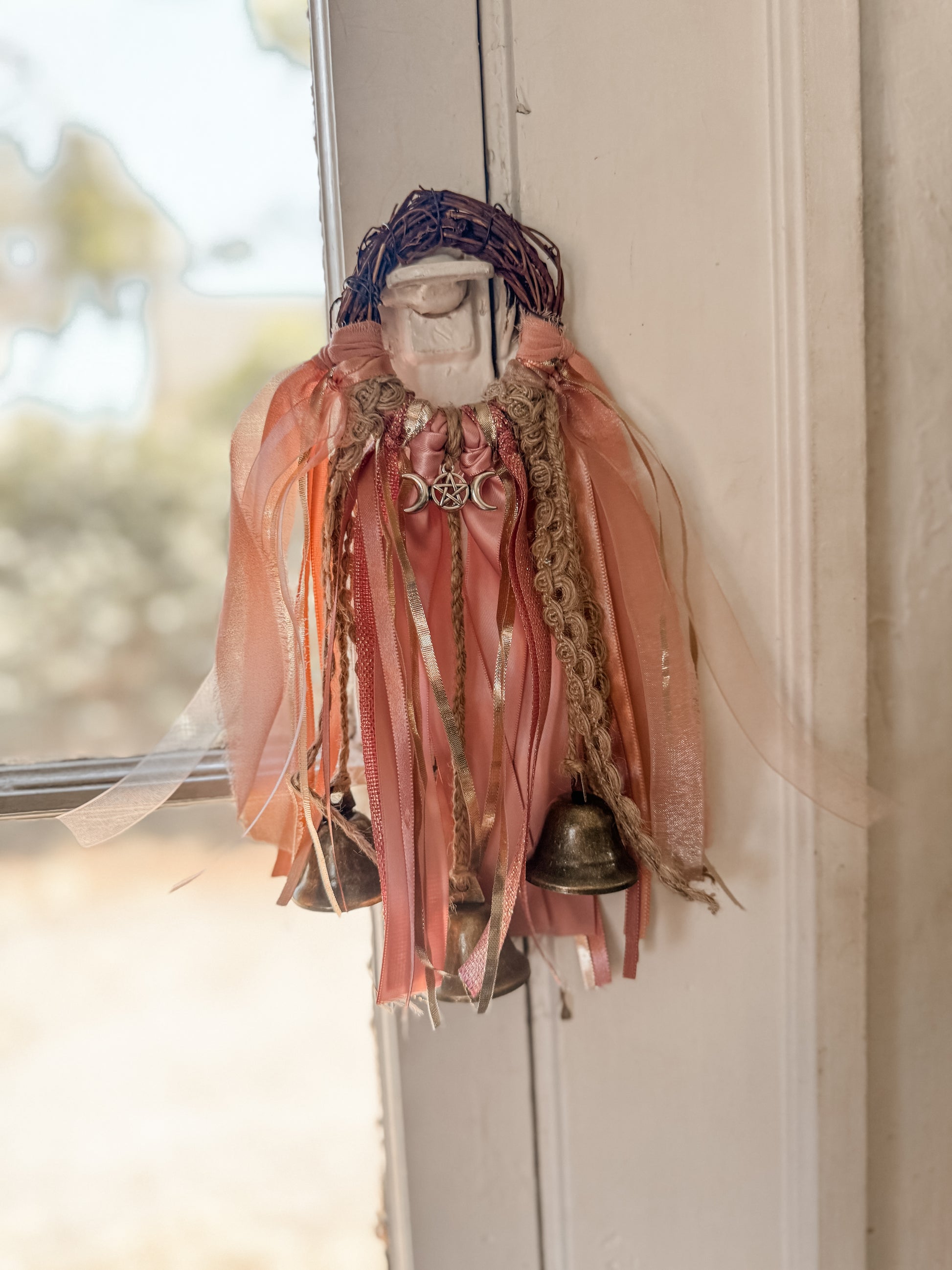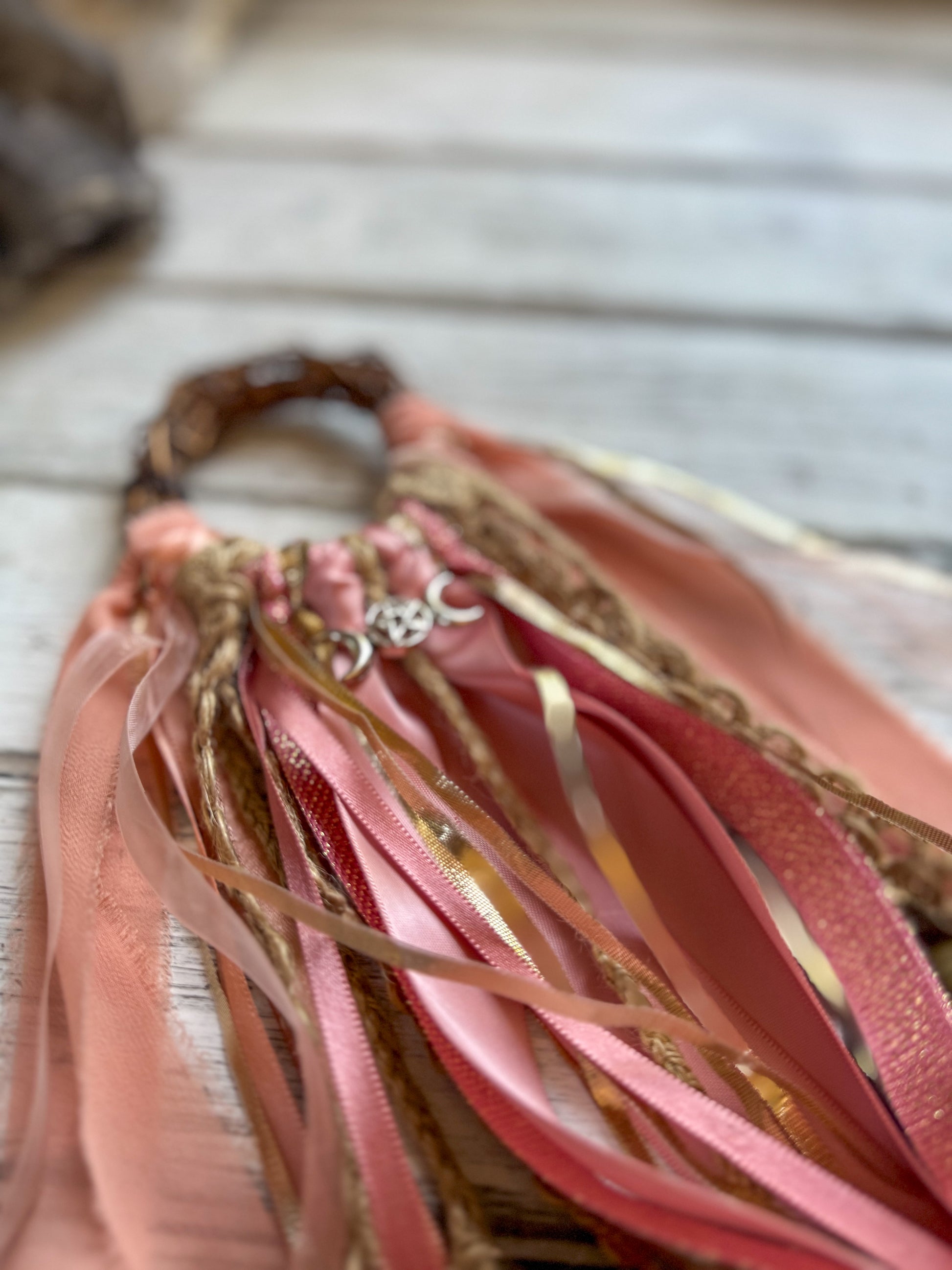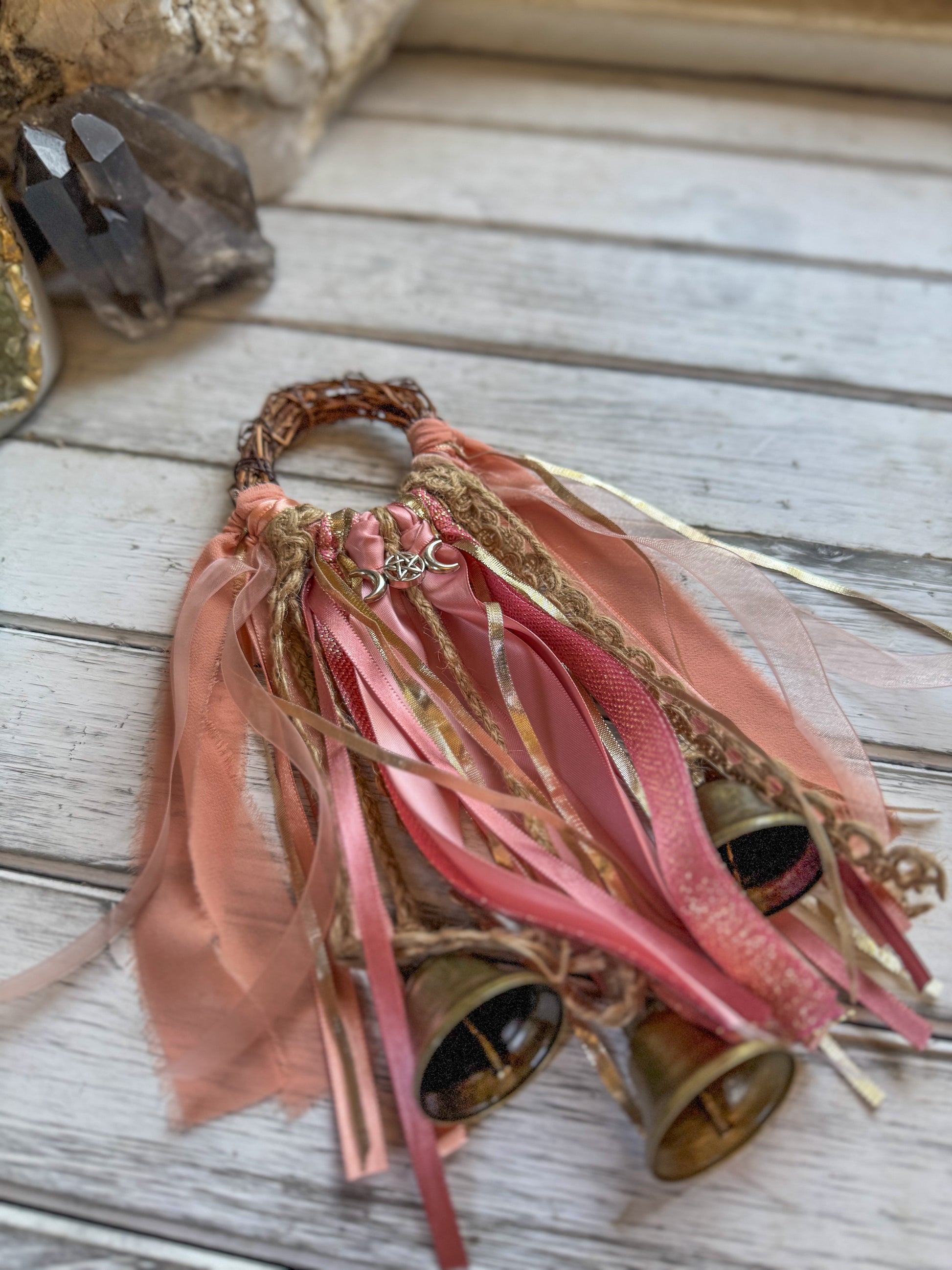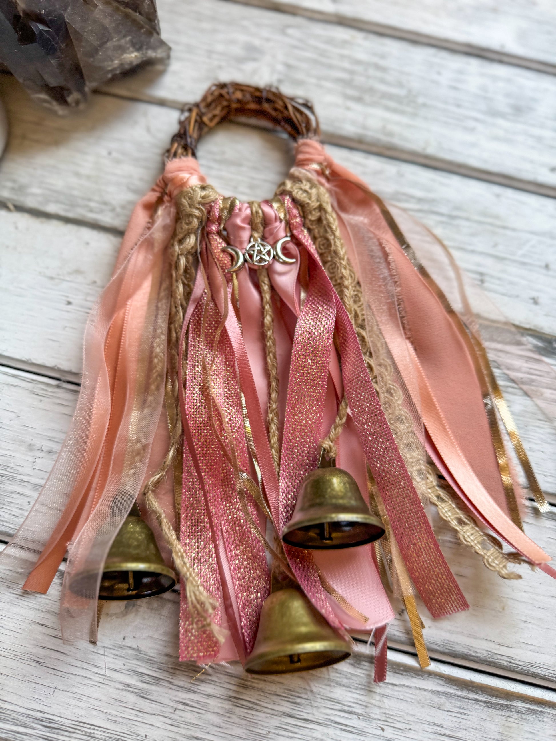Ribbons in rosy peach, coral pink, and golden shimmer cascade with soft, glowing energy. With the triple moon pentacle at its center, this witch bell channels love, renewal, and protective warmth—perfect for inviting harmony into your home or sacred space.