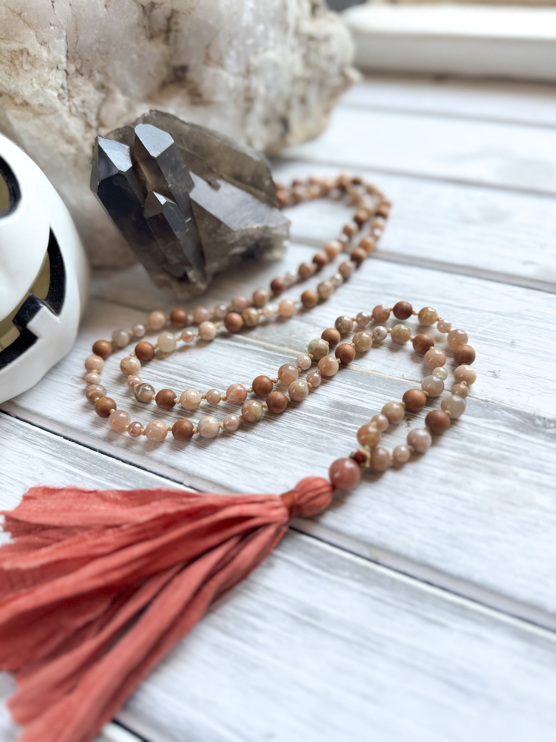 This mala pairs the radiant energy of Sunstone — a crystal of joy, vitality, and confidence — with sacred Agarwood beads, long revered for their grounding and meditative properties. Finished with a hand-tied sari silk tassel, this piece is a talisman of fiery inspiration rooted in calm strength, guiding you to shine brightly while staying deeply grounded.