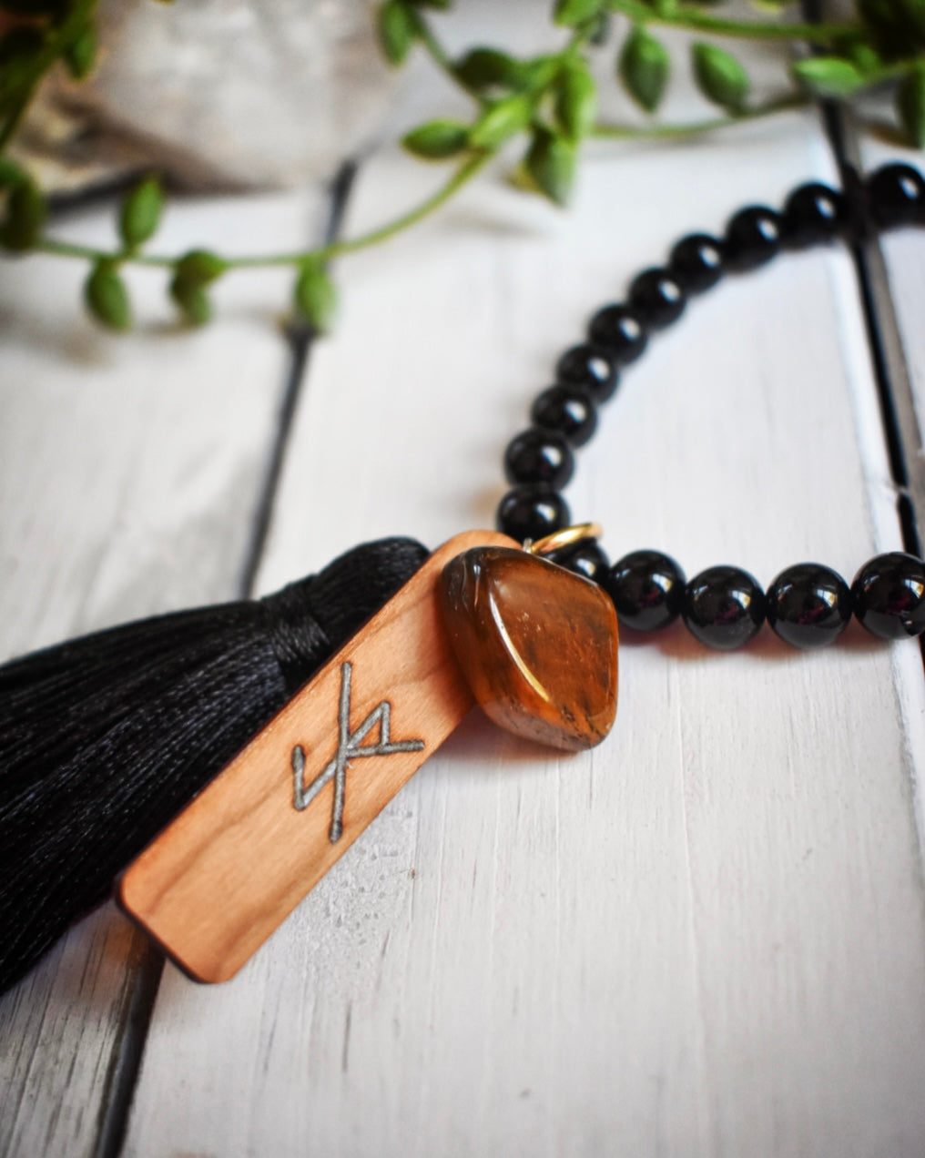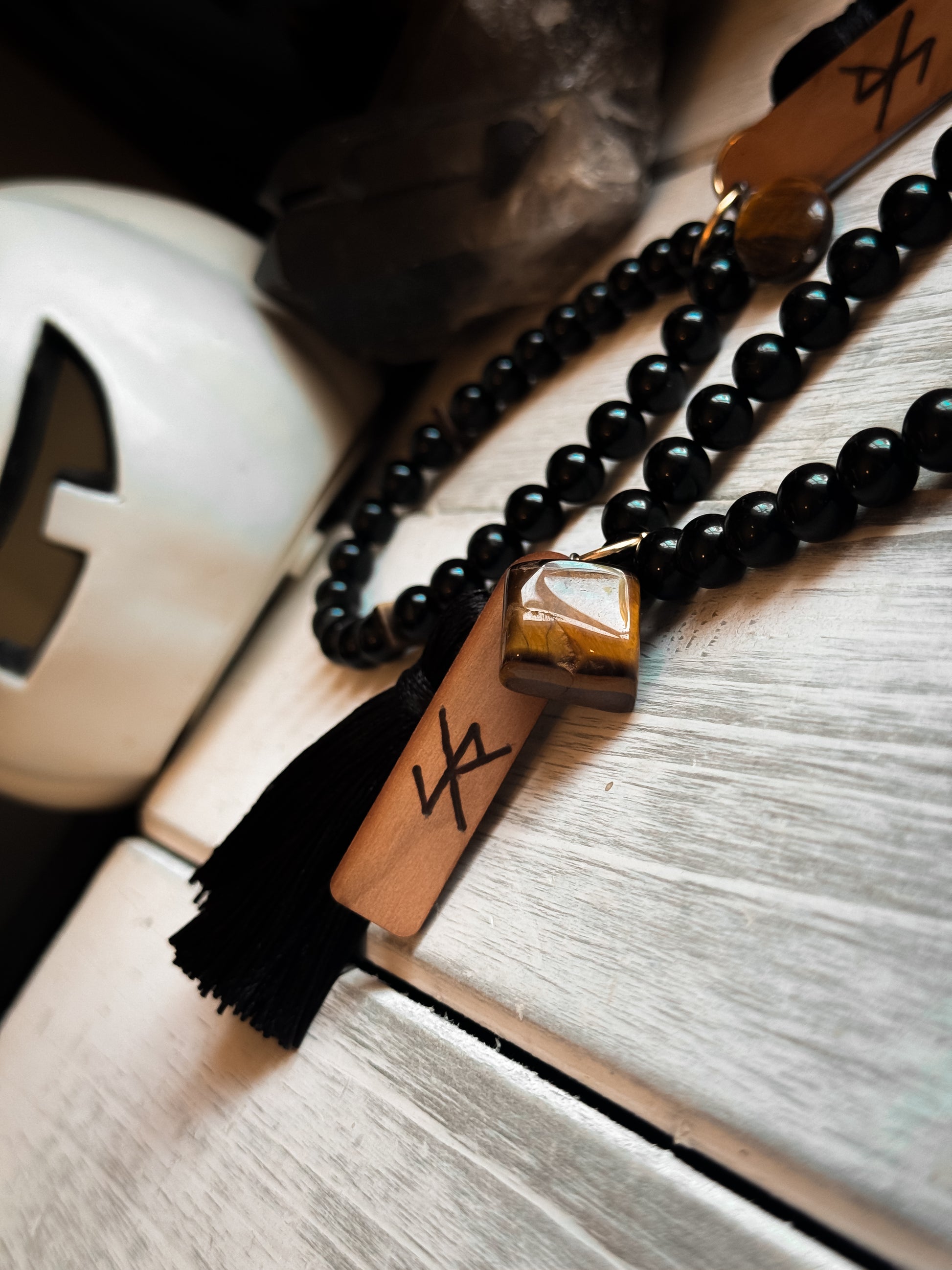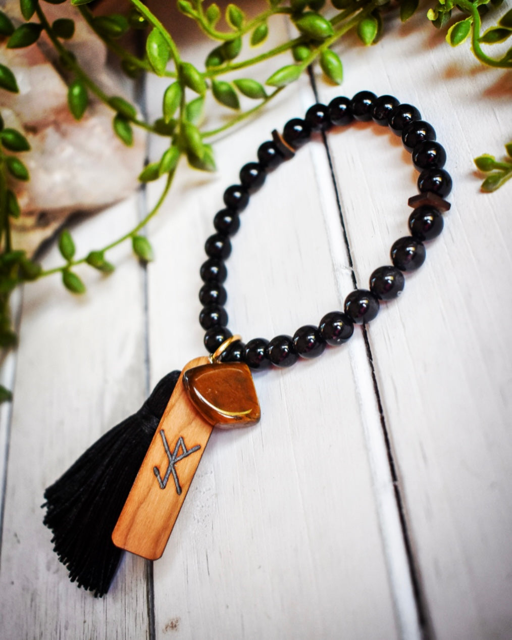 Made with 27 beautiful Black Tourmaline beads, Tigers Eye charm, black tassel & wooden plaque with a Bind-Rune specifically for protection while driving hand burned by my husband.
