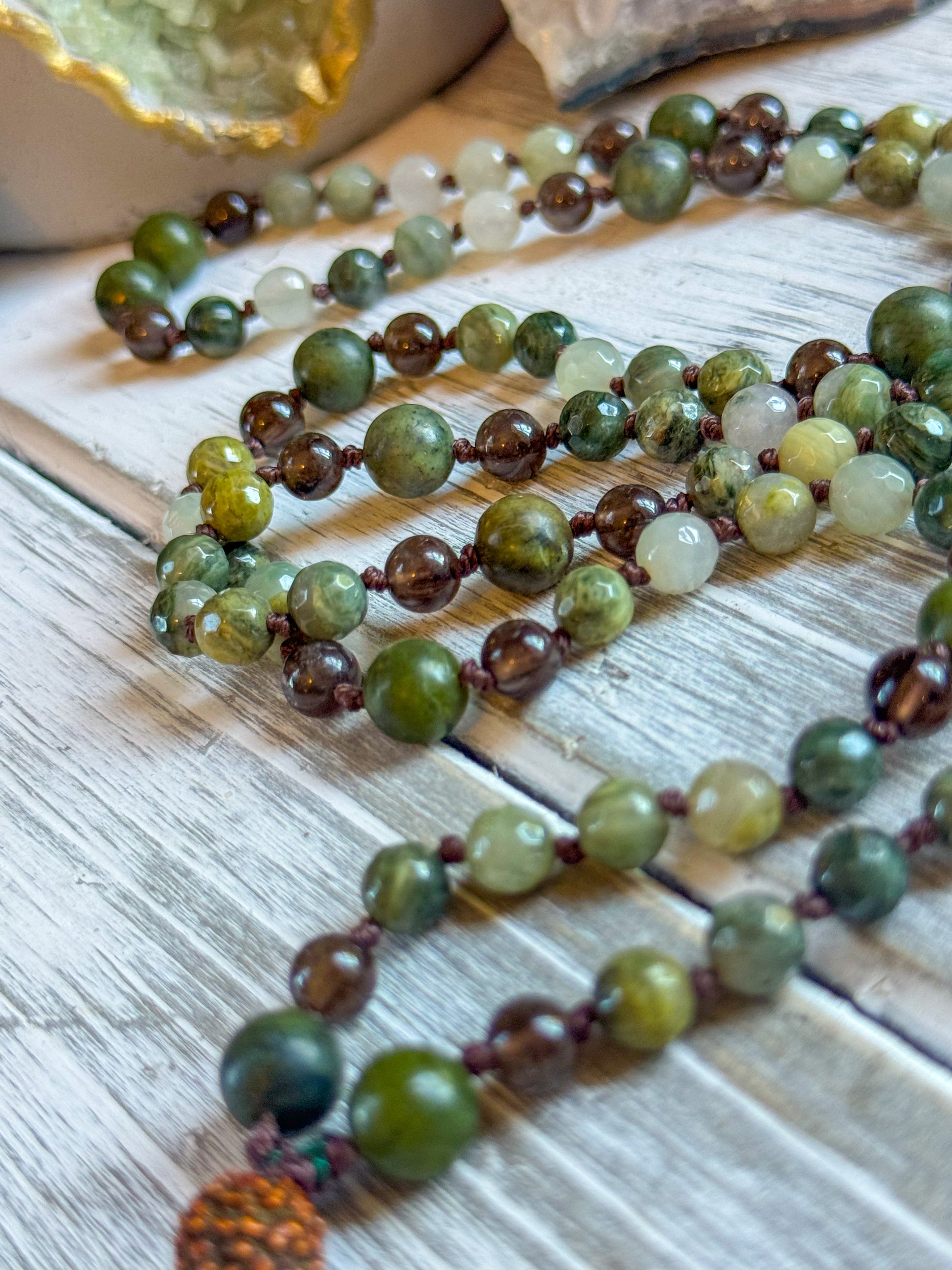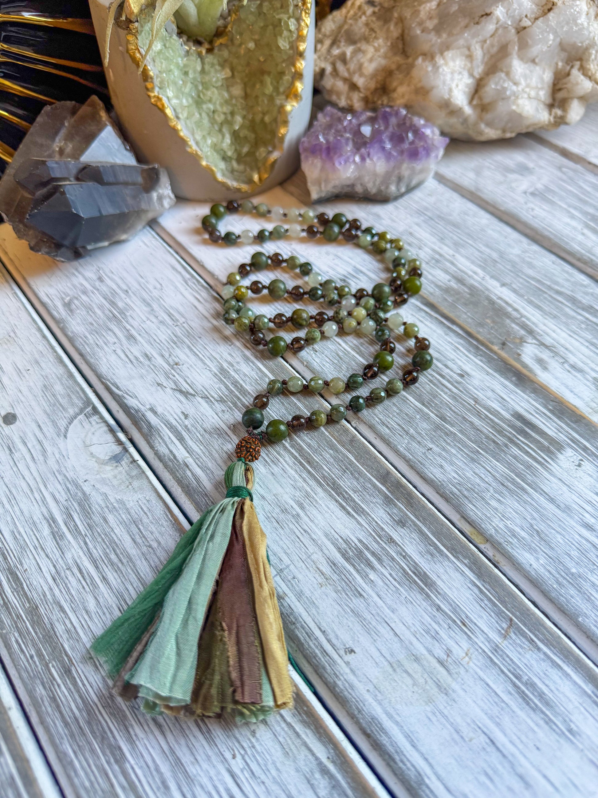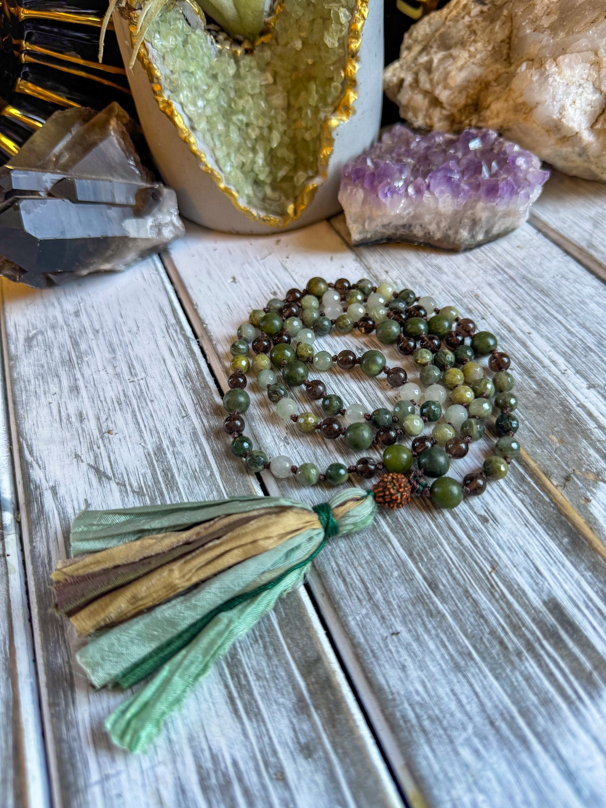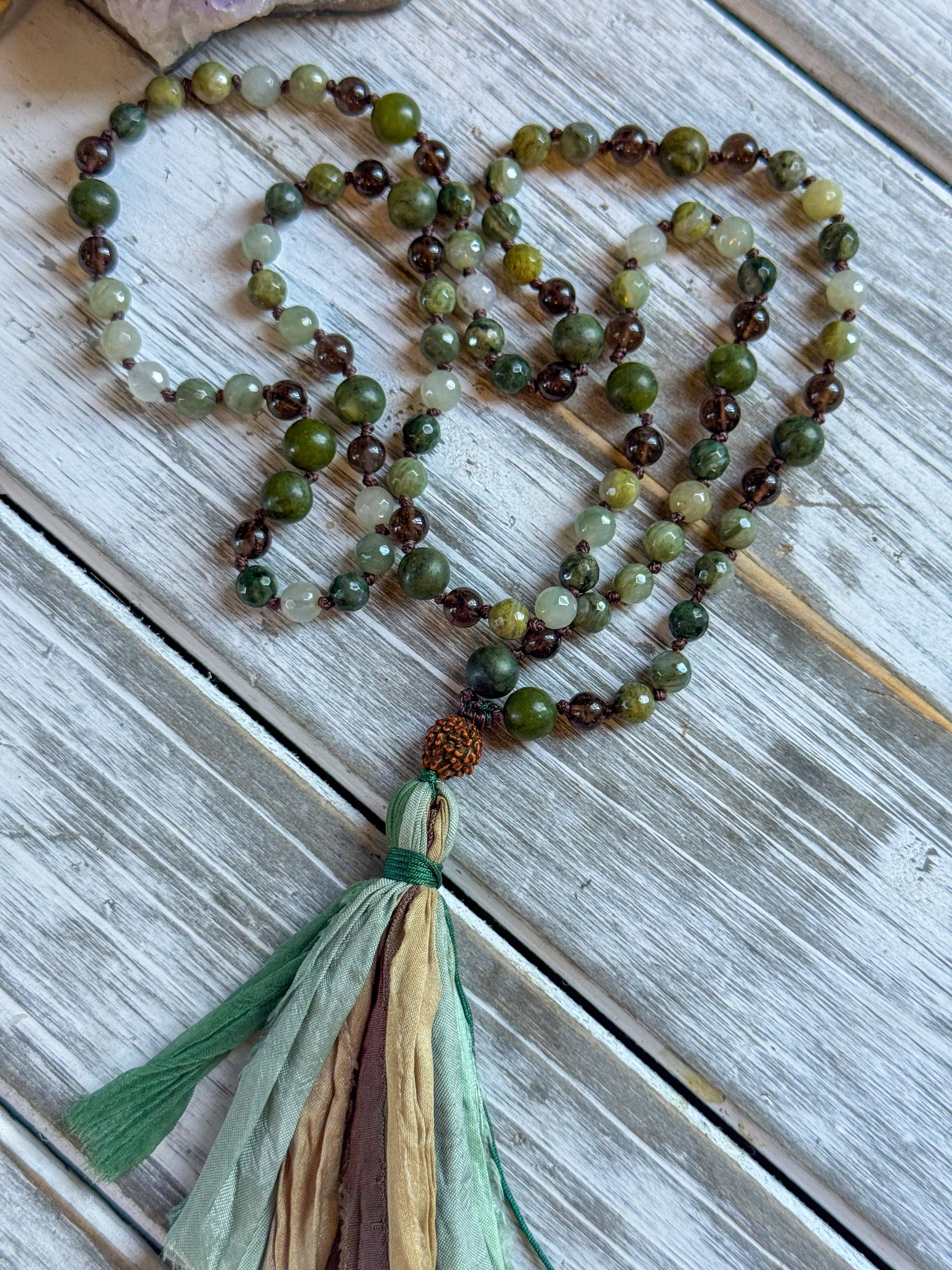 Materials: Handmade with genuine Olive Green Jade, Smoky Quartz, and Green Rutilated Quartz beads, finished with a multi-tone green sari silk tassel and Rudraksha seed accent.