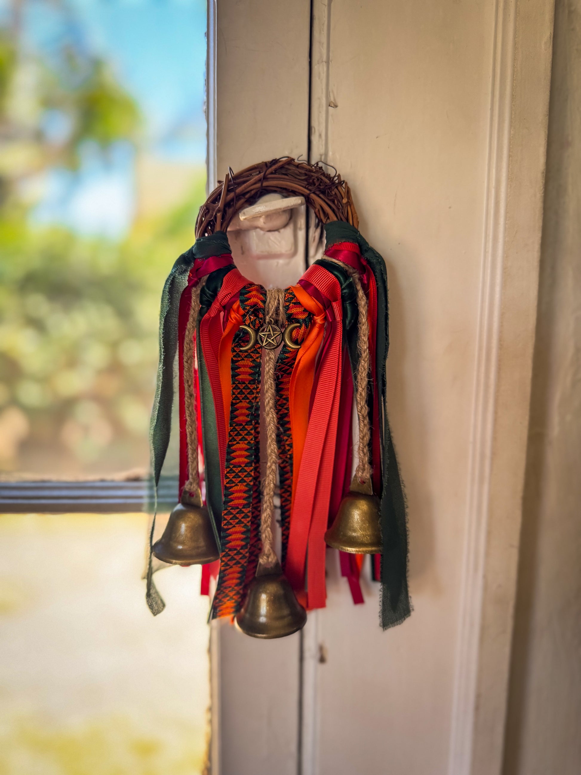 Vibrant ribbons of fiery orange, scarlet red, and grounding forest green blaze together like a woodland bonfire. With the golden triple moon pentacle at its center, this witch bell embodies transformation, balance, and protective fire energy—perfect for seasonal altars or doorways.