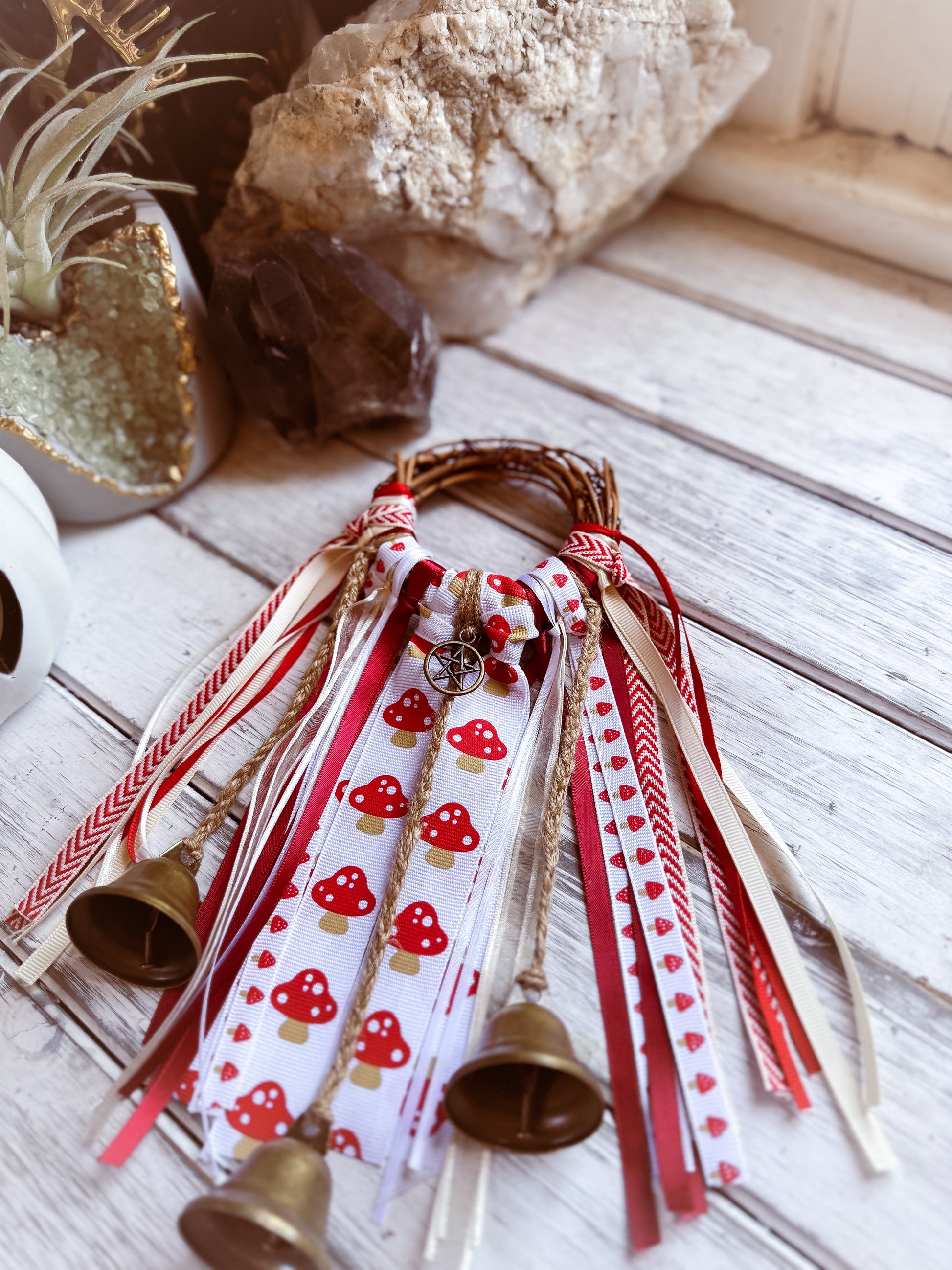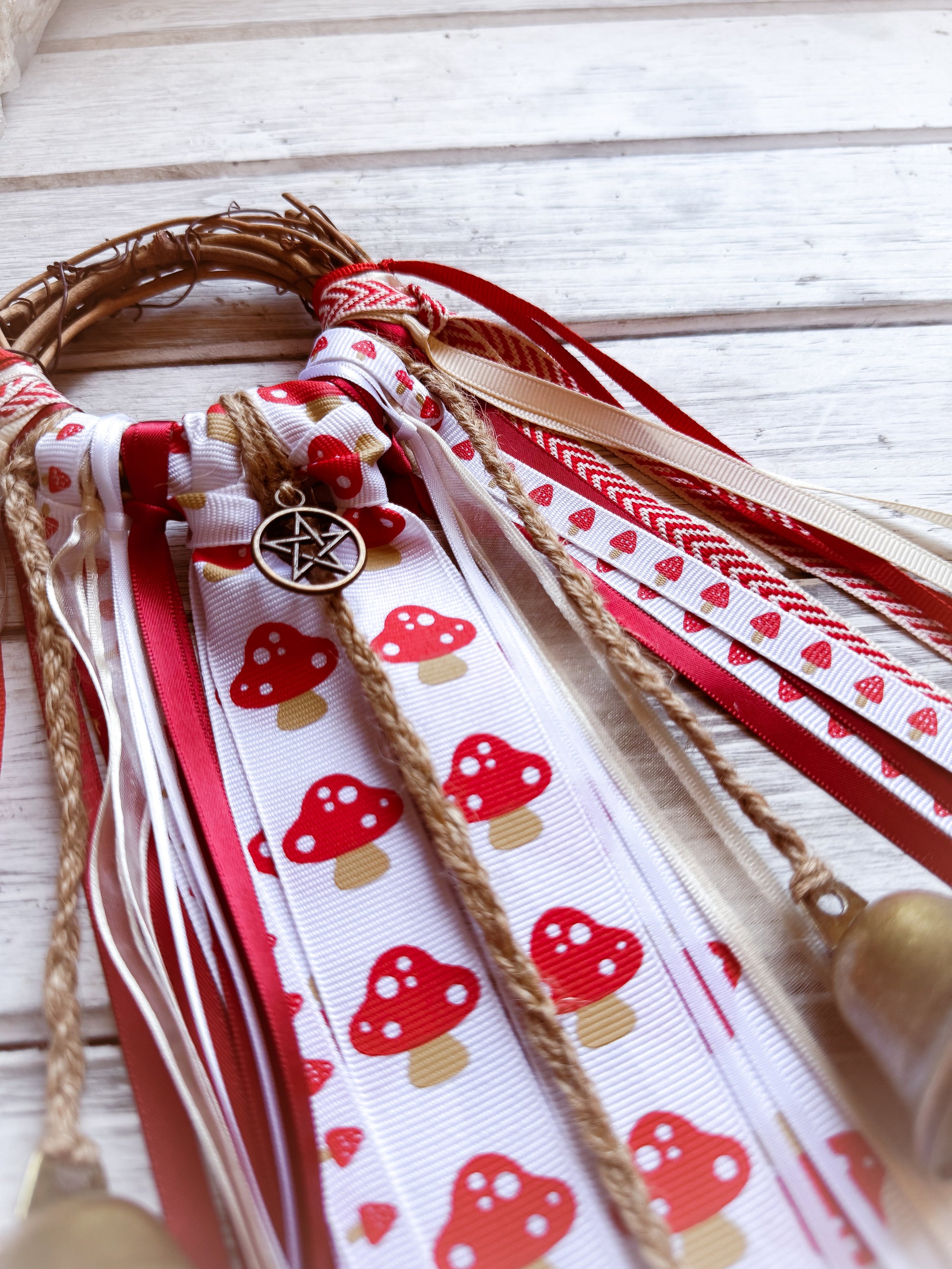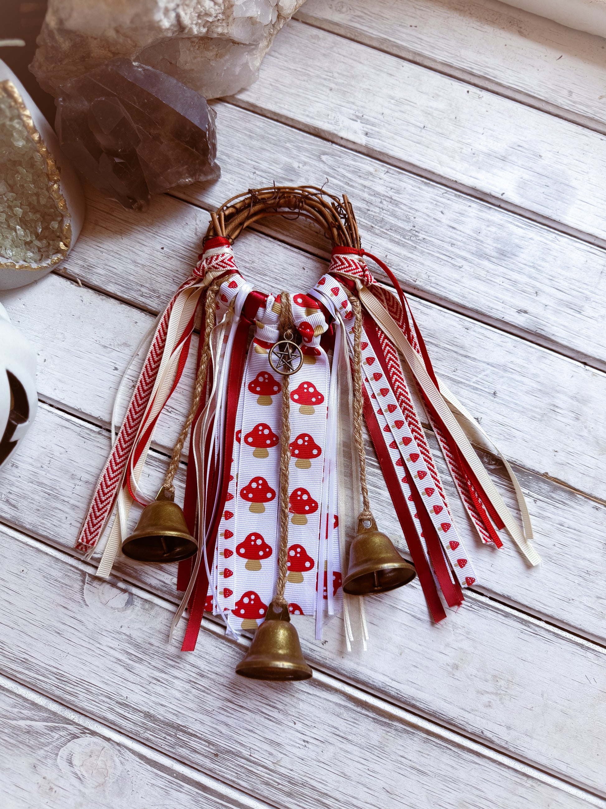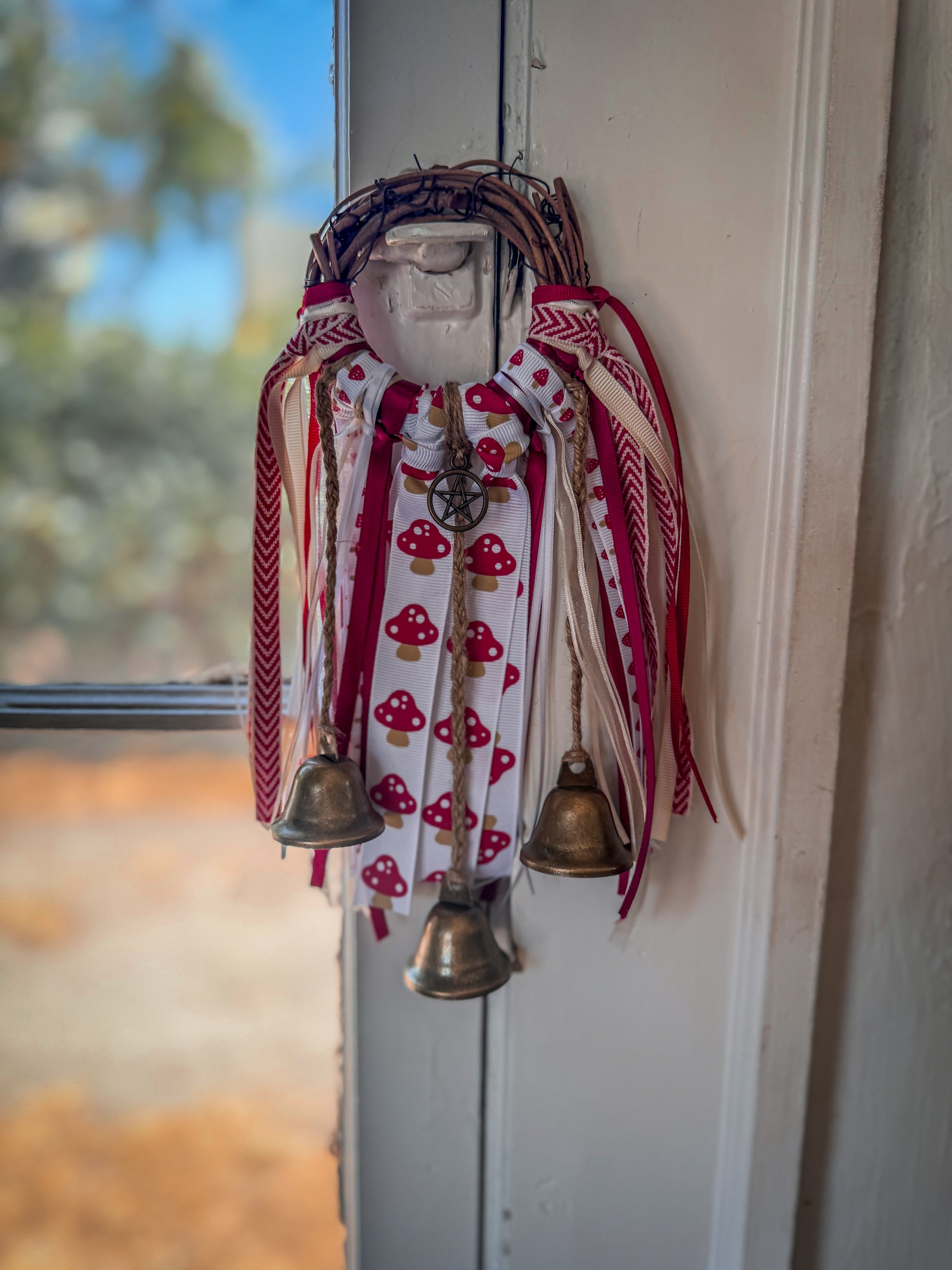 Bright red, cream, and earthy beige ribbons dance with cheerful mushroom and heart patterns, creating a piece that feels straight out of an enchanted woodland. Anchored with a protective pentacle, this witch bell channels joy, playfulness, and fae magic while keeping your space safe.