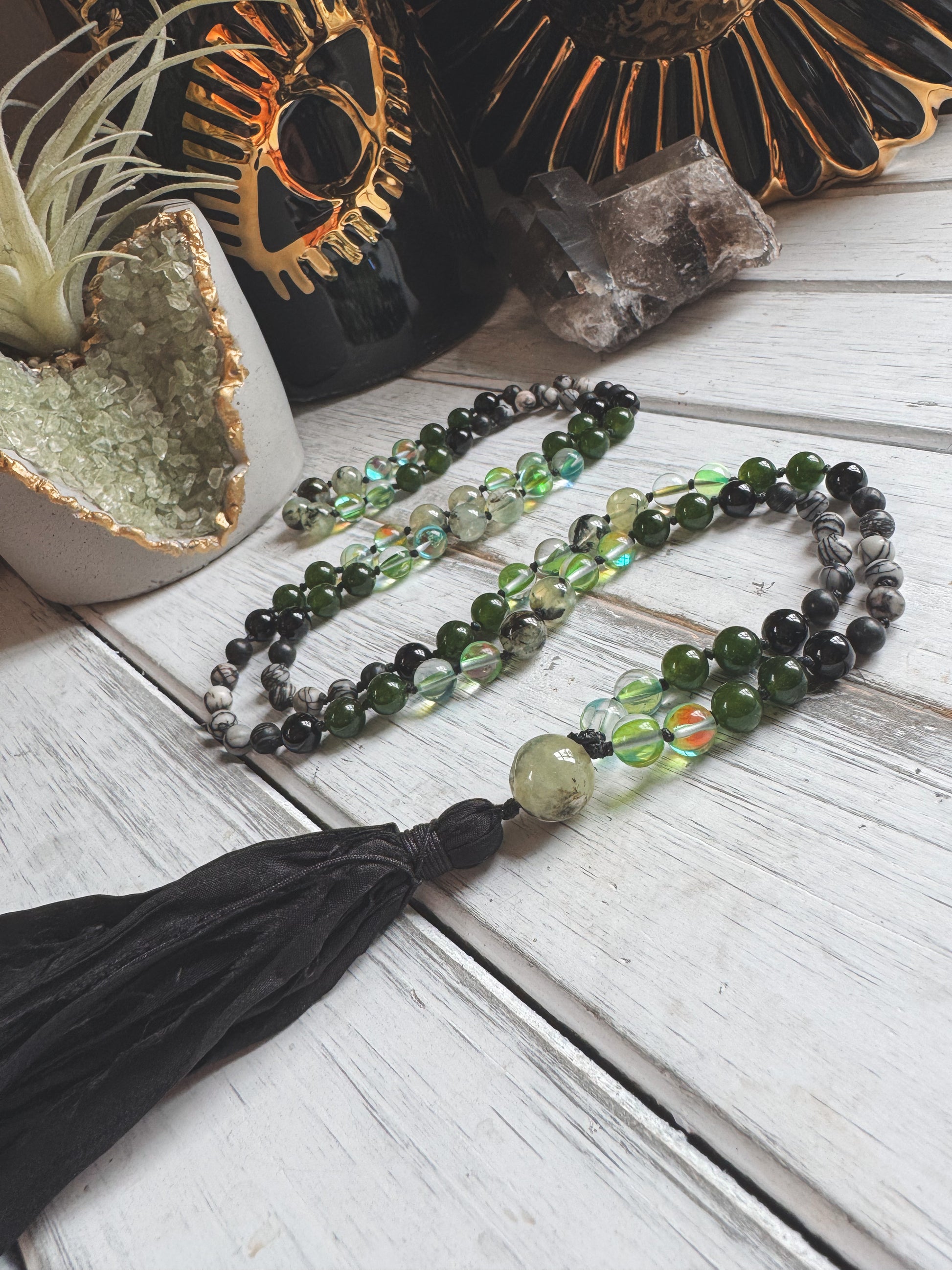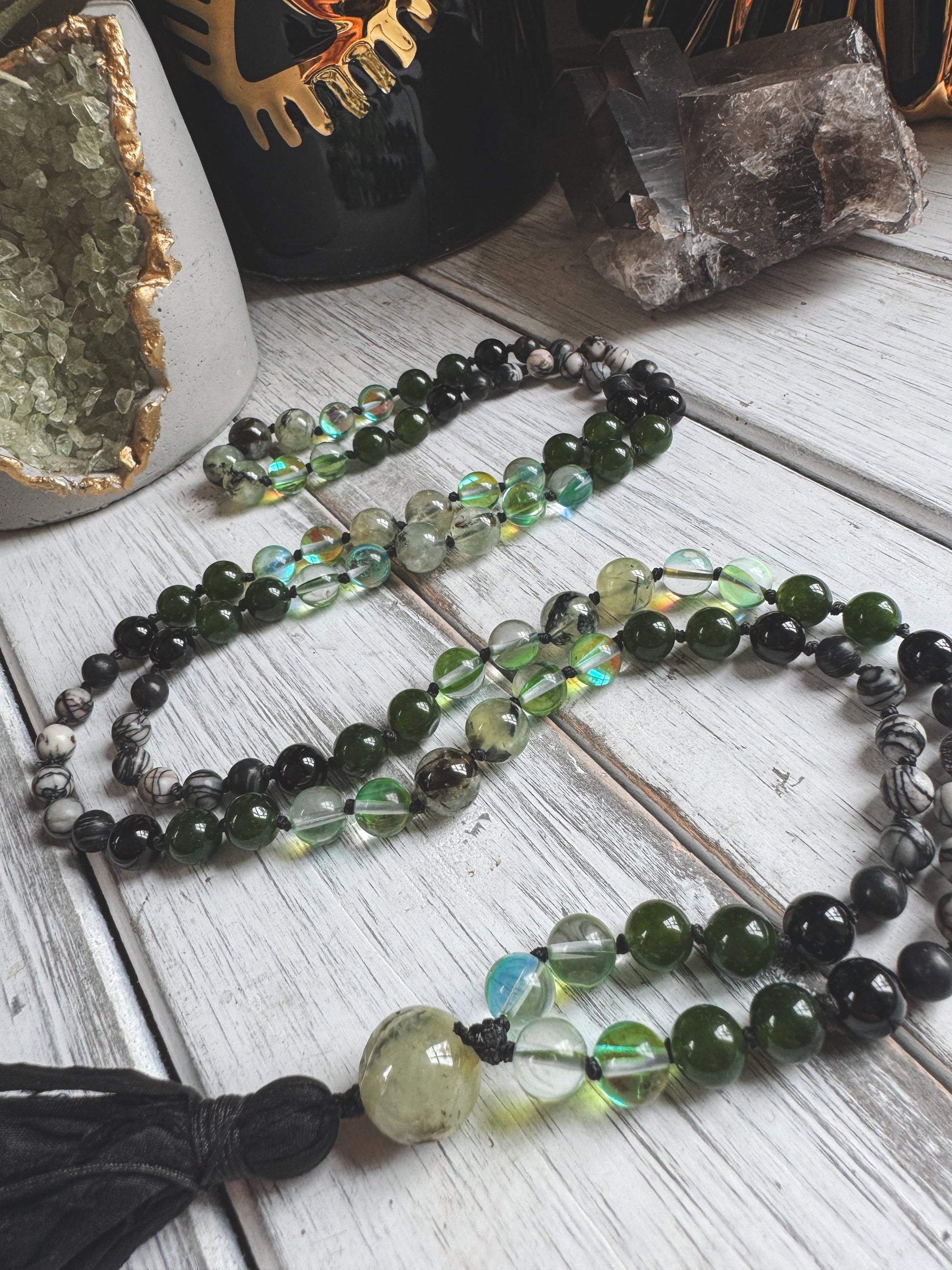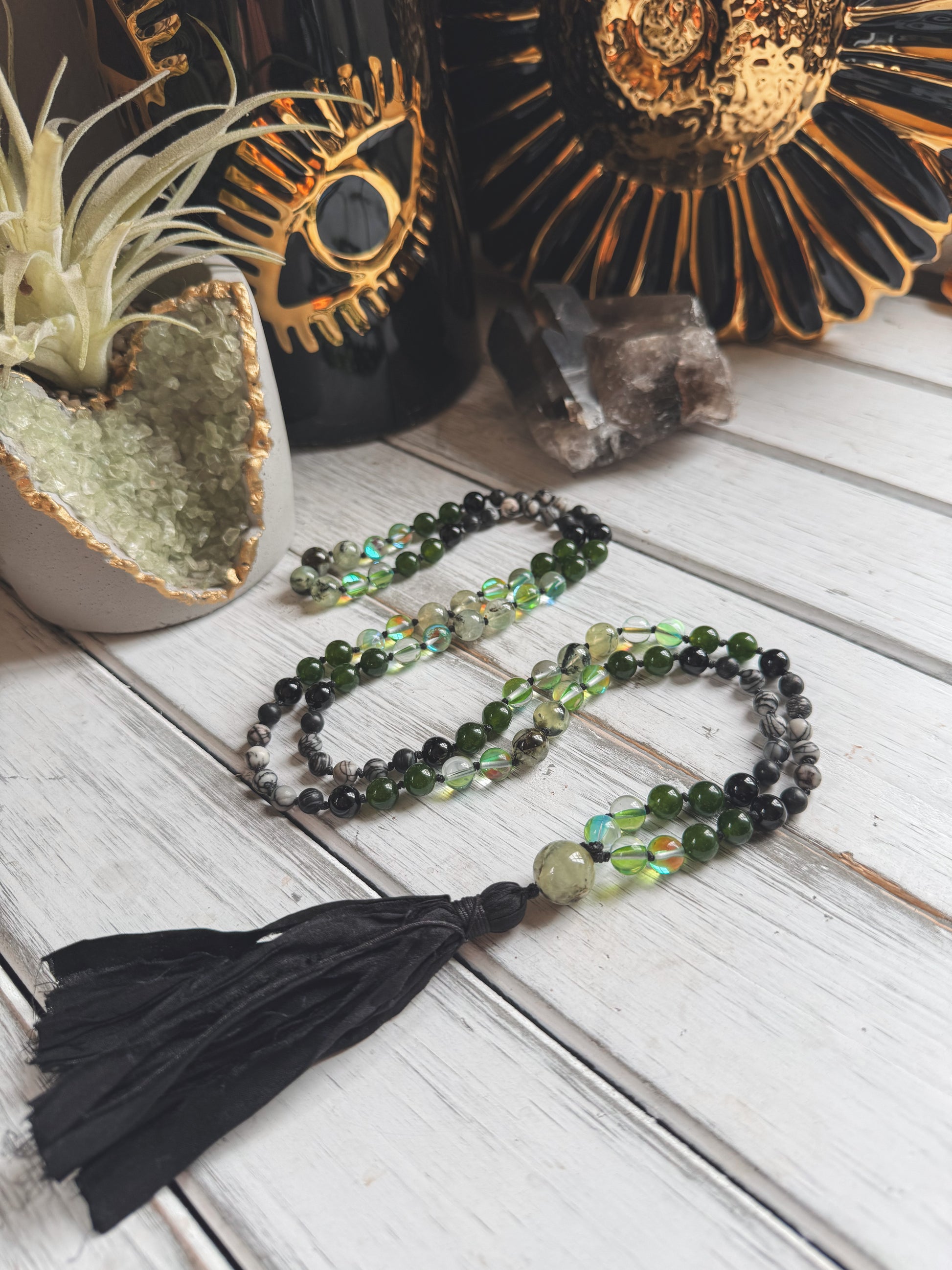 Made with Mystic Green Aura Quartz, Winter Green Jade, Obsidian, Spiderweb Jasper, Prehnite