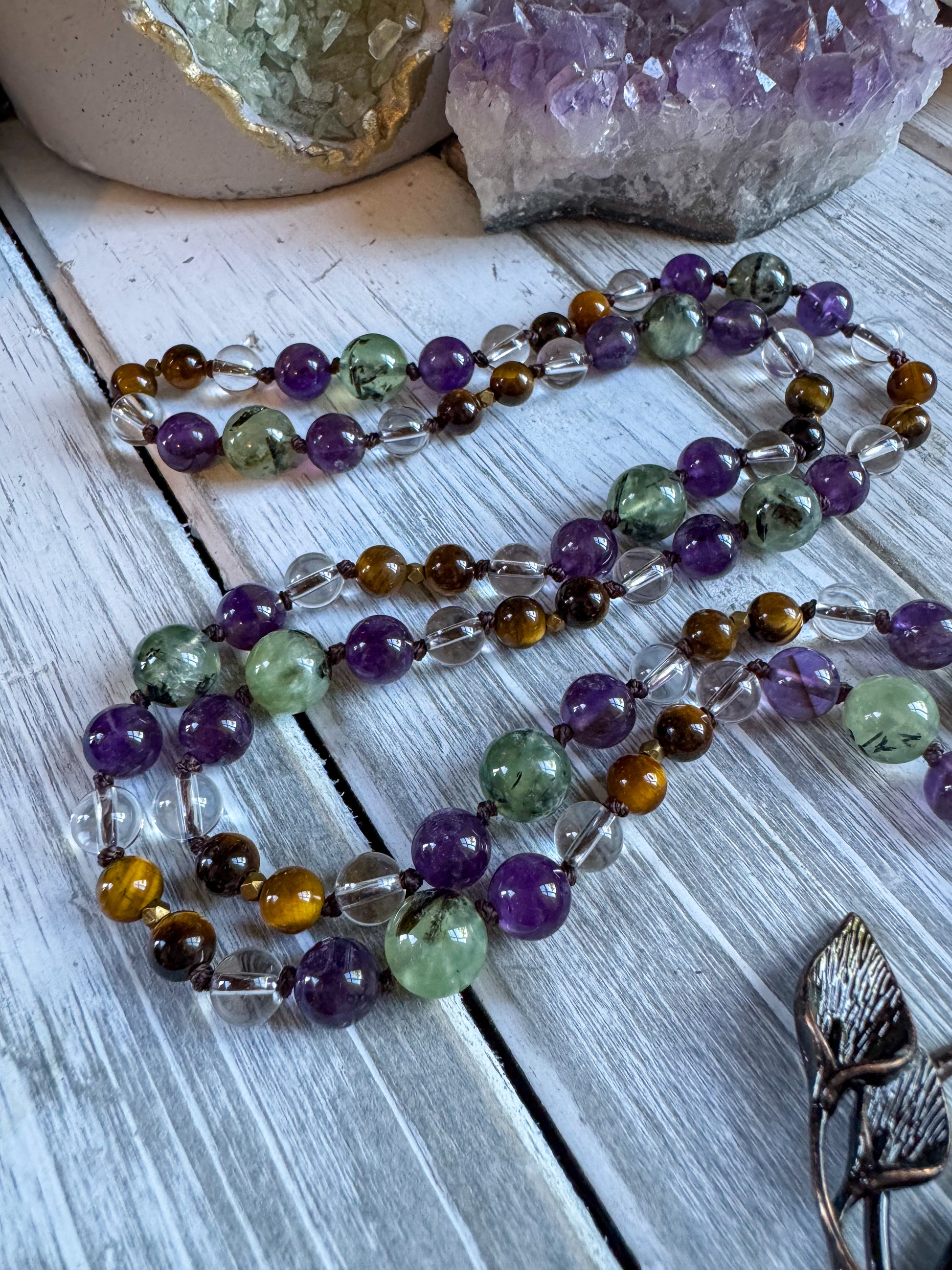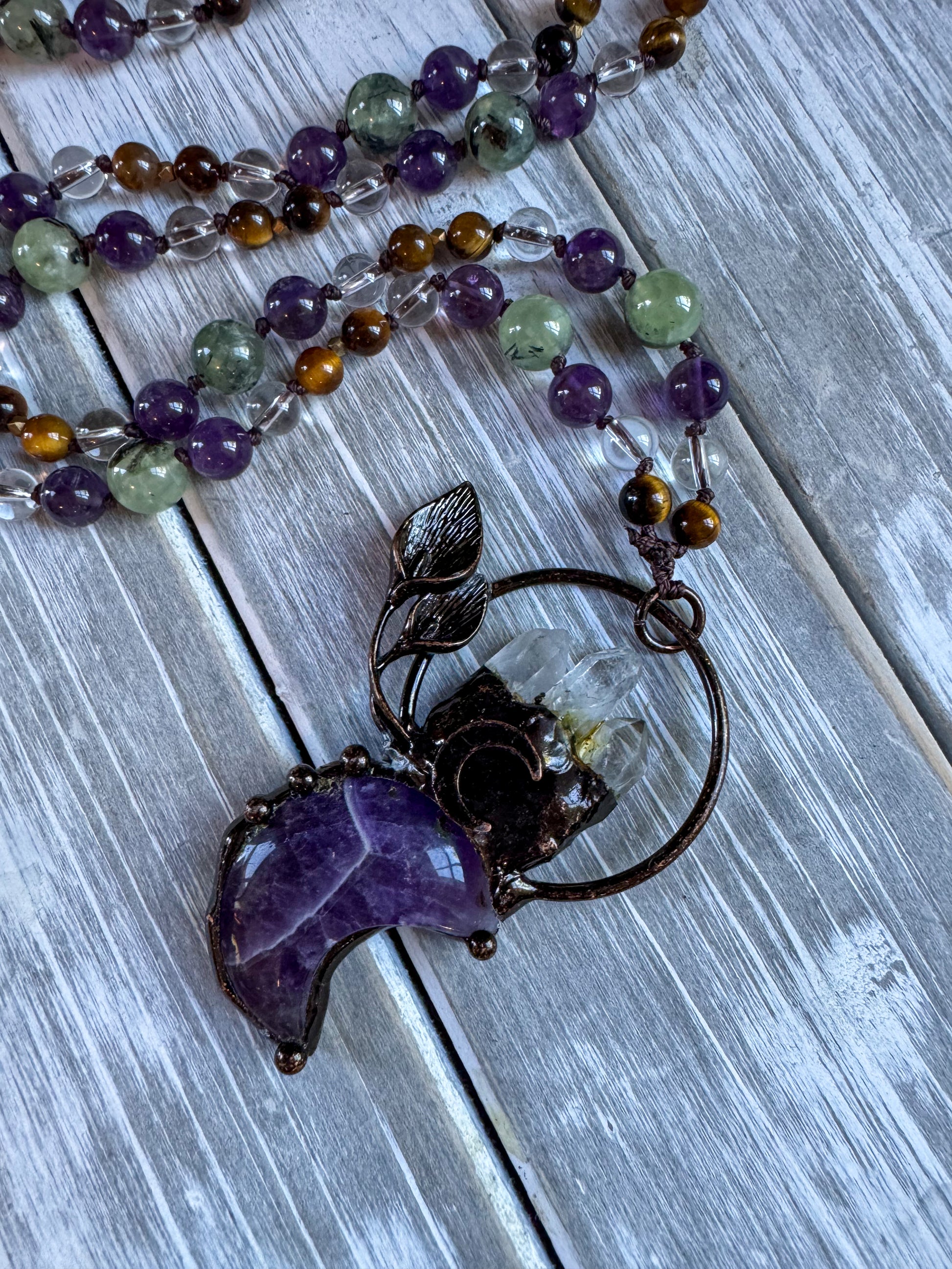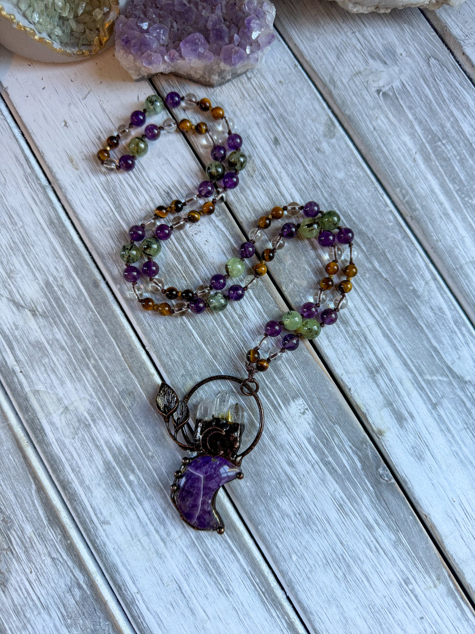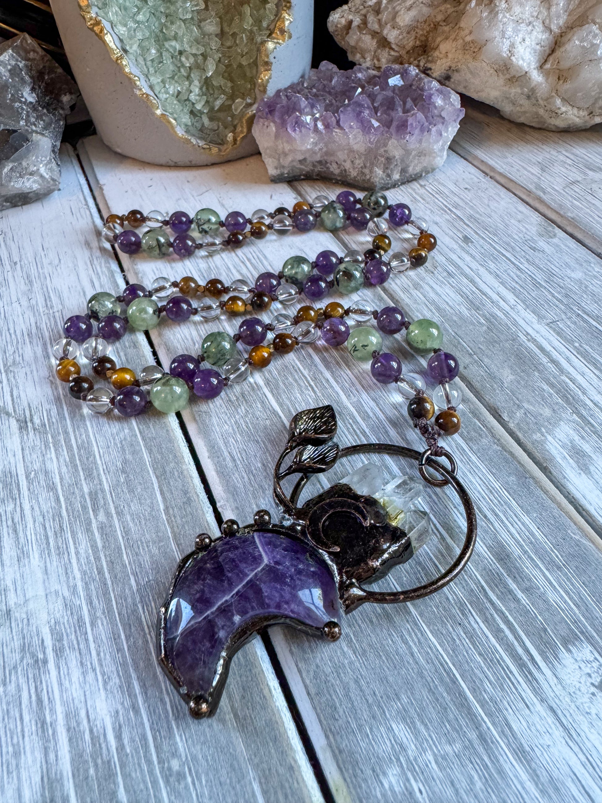 Materials: Handmade with genuine Amethyst, Epidote in Prehnite, Tiger’s Eye, and Clear Quartz beads, featuring a hand-electroformed Amethyst crescent moon and Quartz crystal pendant