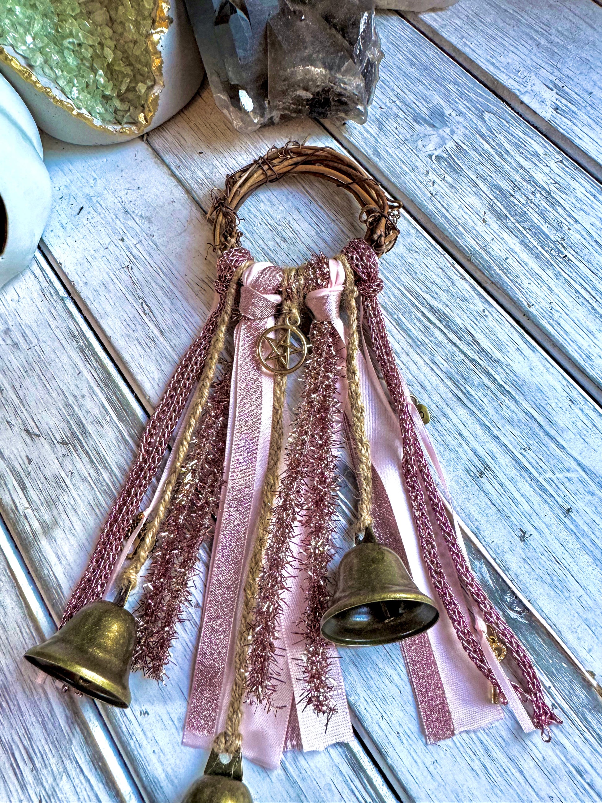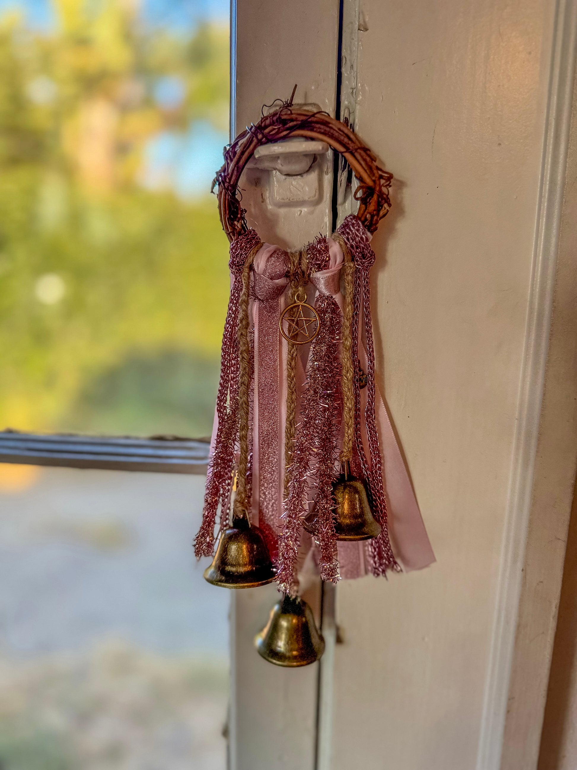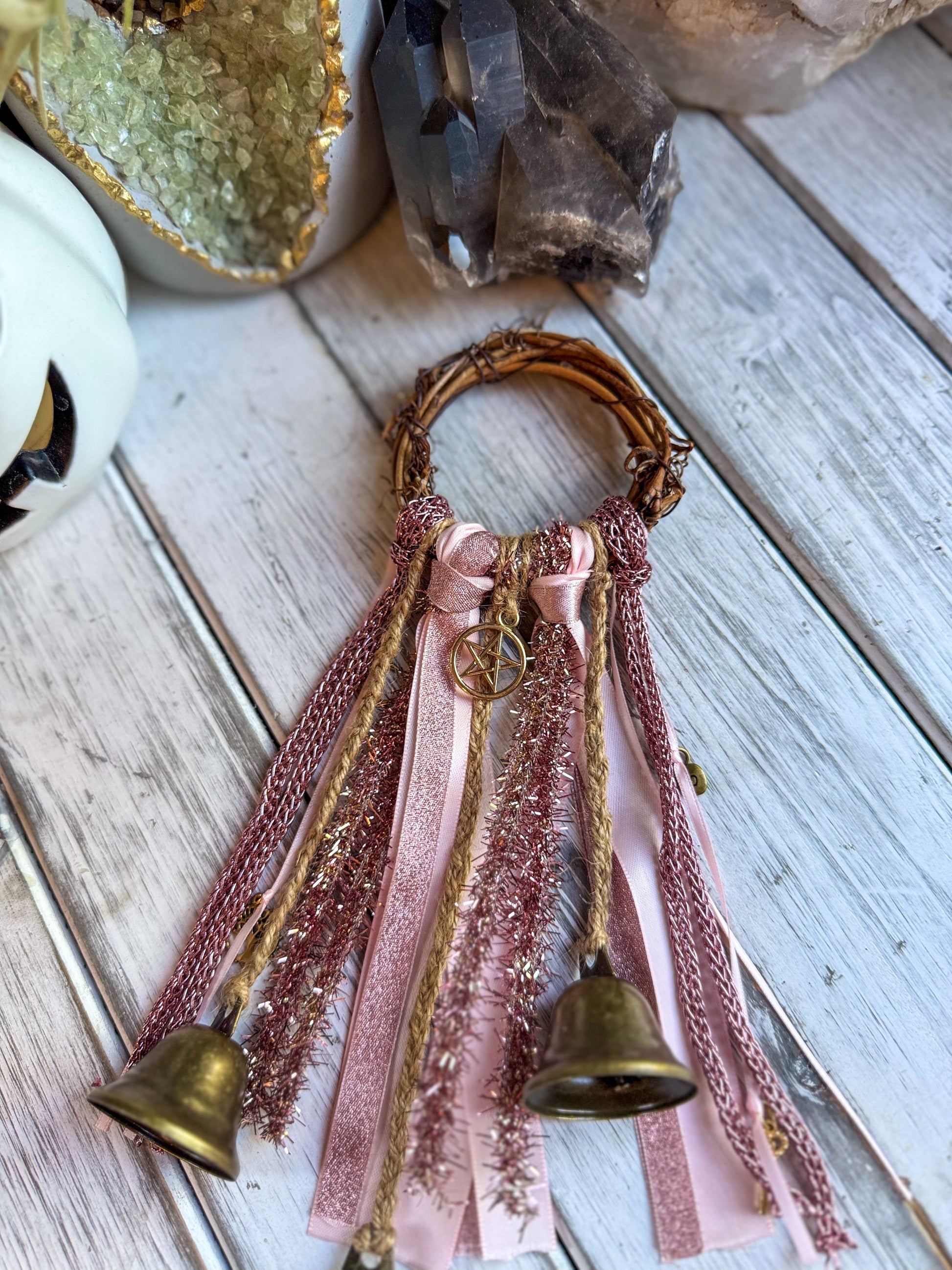 Soft blush and rose-gold ribbons shimmer with a touch of glamour, while the central pentacle offers steady protection. This witch bell channels love, beauty, and gentle strength—perfect for filling your space with warmth and enchantment.