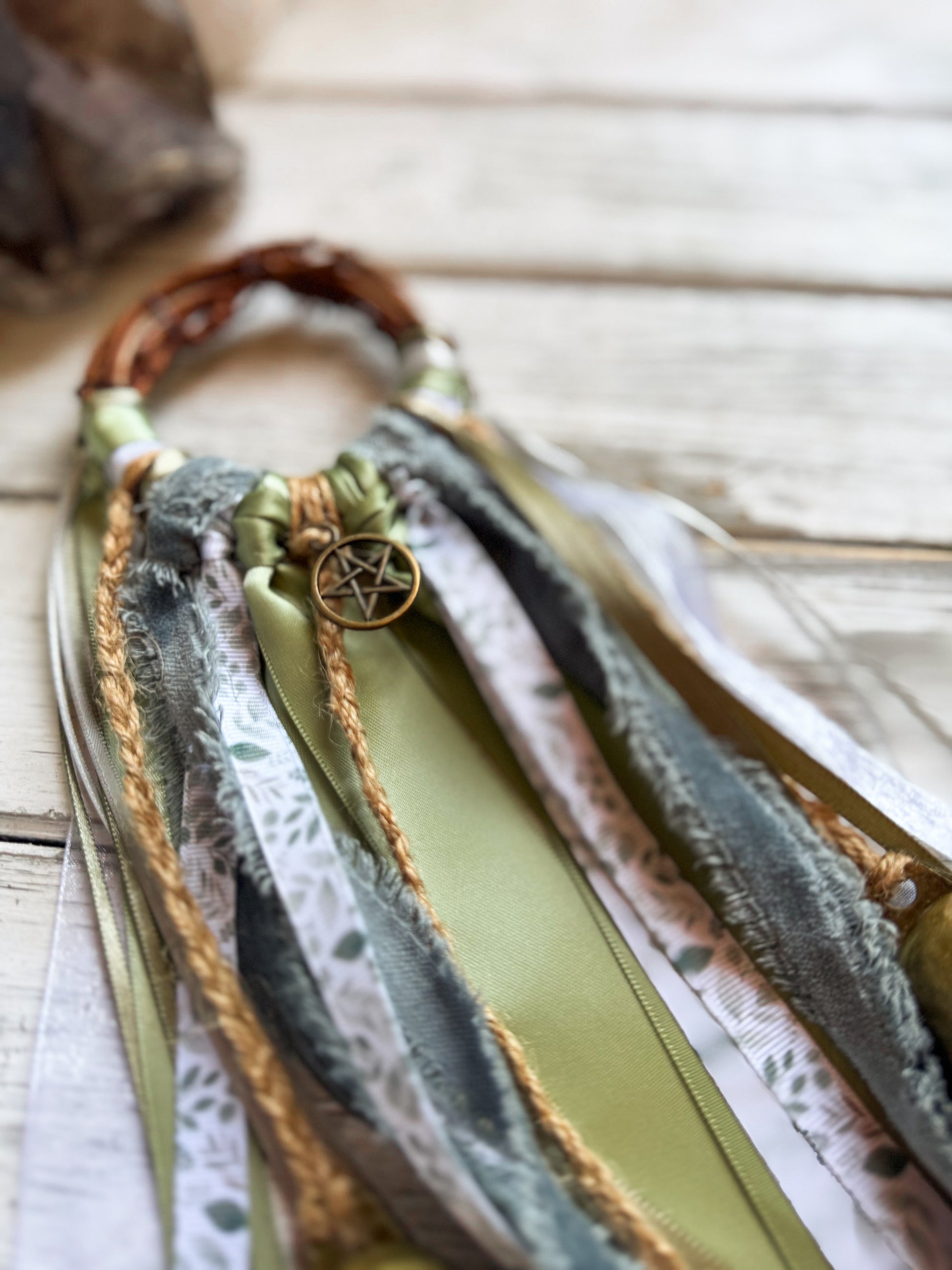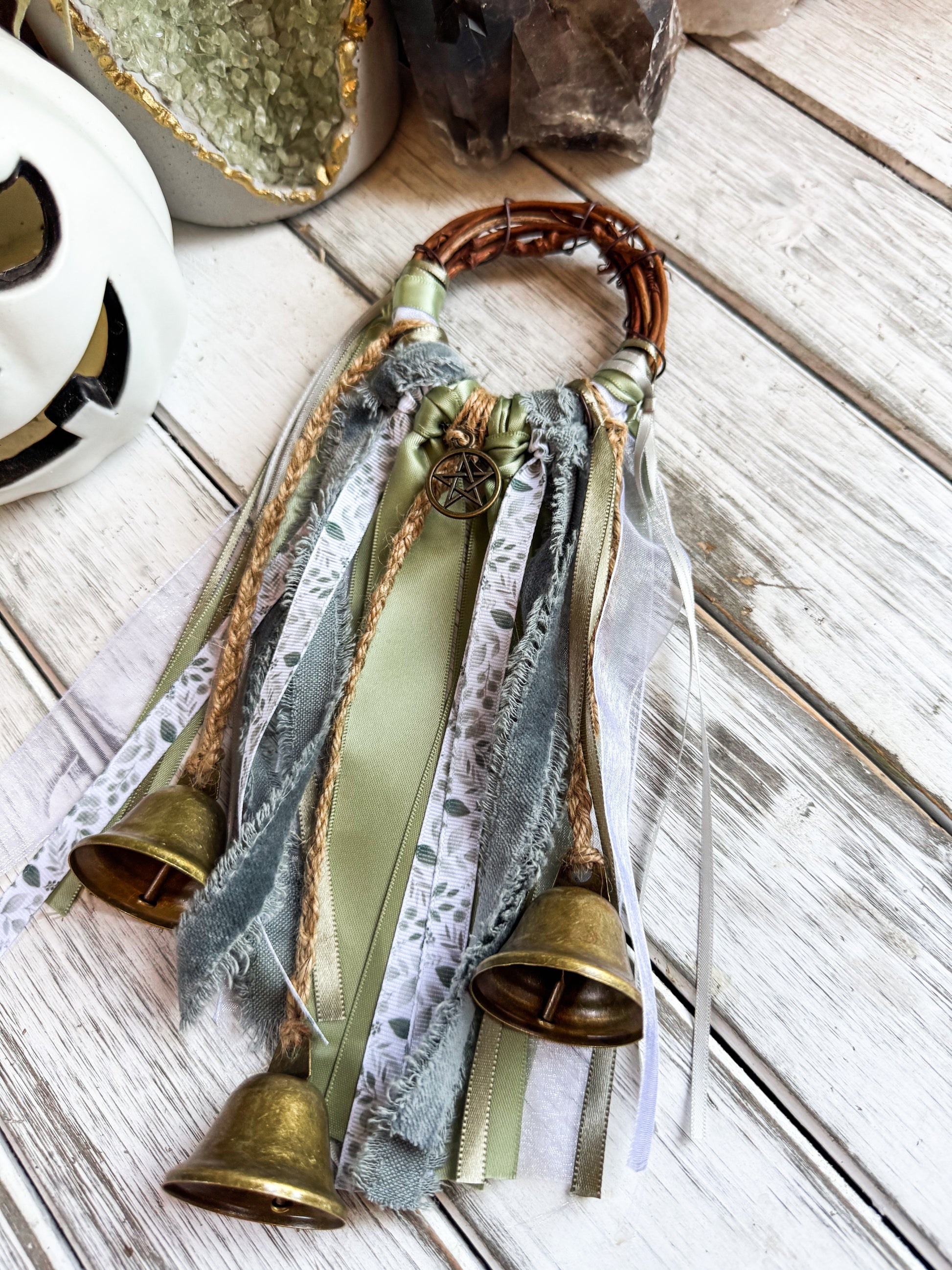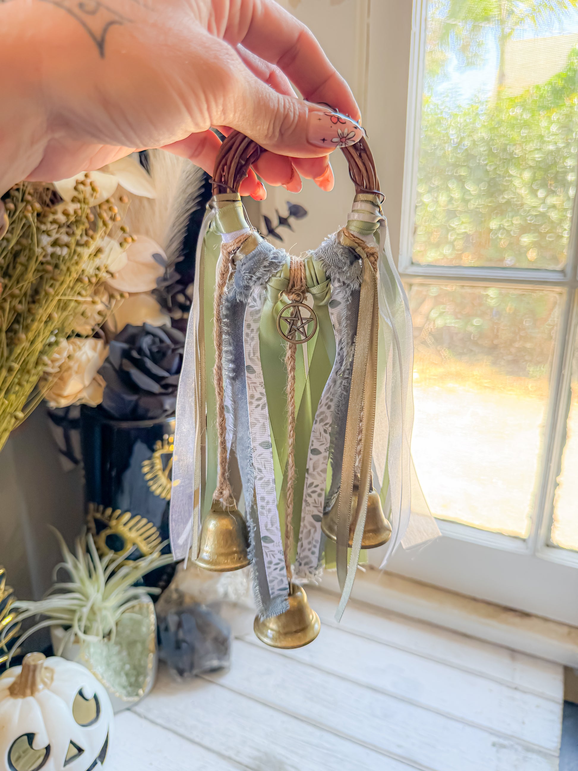 Soft sage greens, leafy accents, and earthy taupe ribbons flow together in a gentle, grounding harmony. The pentacle charm anchors its protective energy, making this witch bell perfect for cleansing spaces, encouraging peace, and keeping negativity at bay.