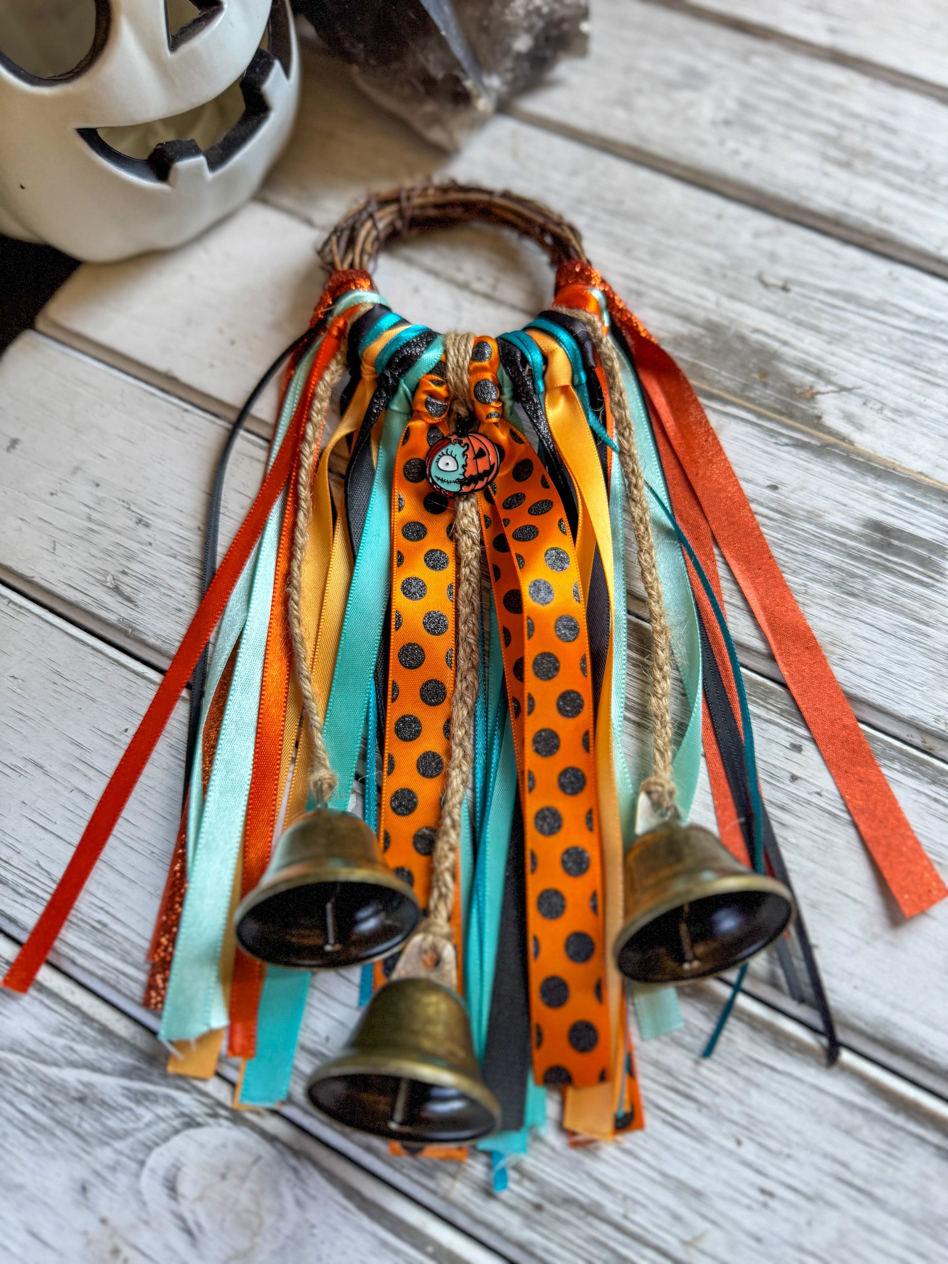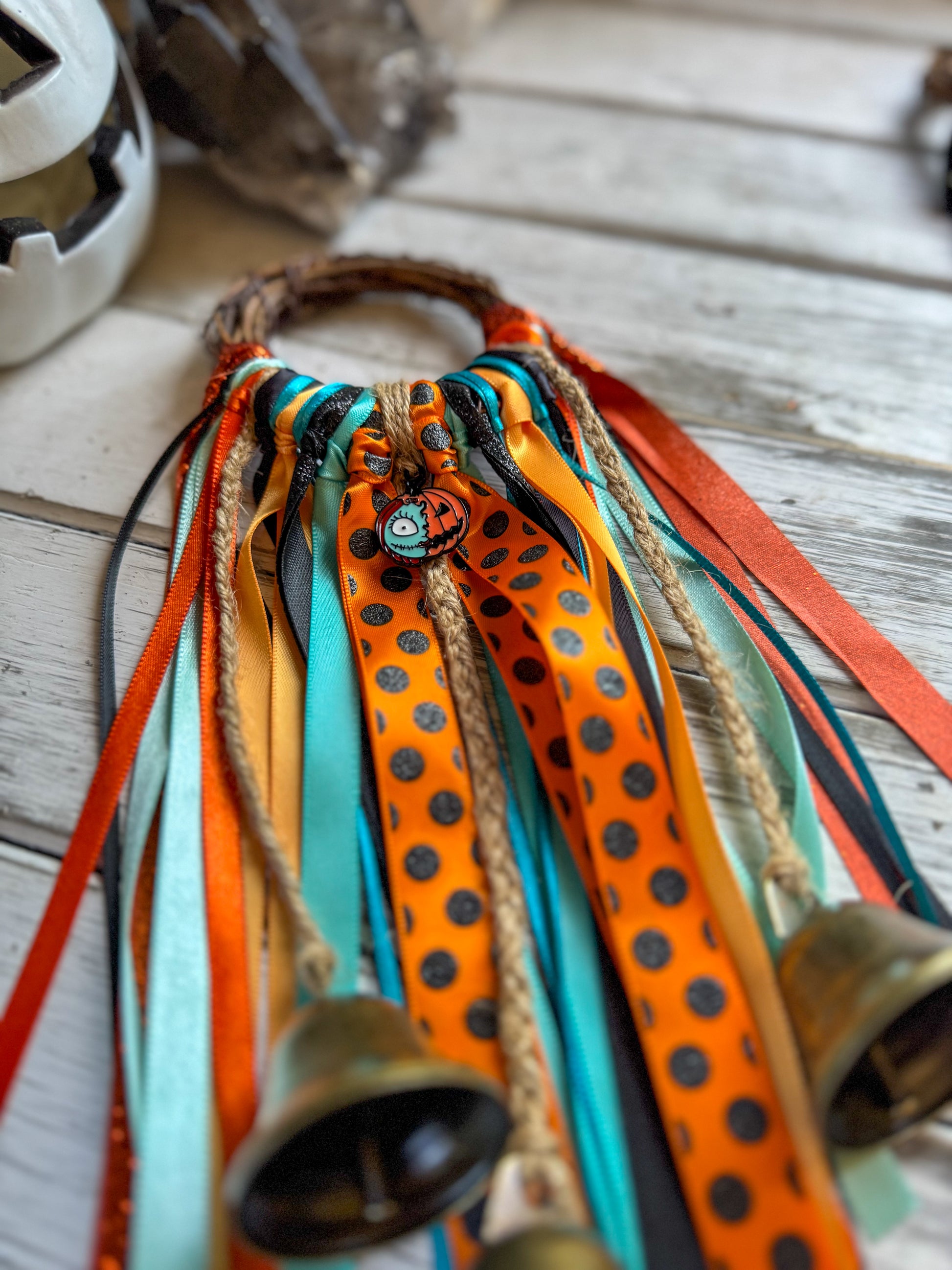 Patchwork ribbons in teal, pumpkin orange, and stitched black polka dots capture the whimsical spirit of Sally herself. At its center hangs a unique Sally-and-jack-o’-lantern charm, embodying her mix of sweetness, resilience, and spooky fun. This bell keeps away negativity while inviting creativity, love, and a little Halloween magic into your space.