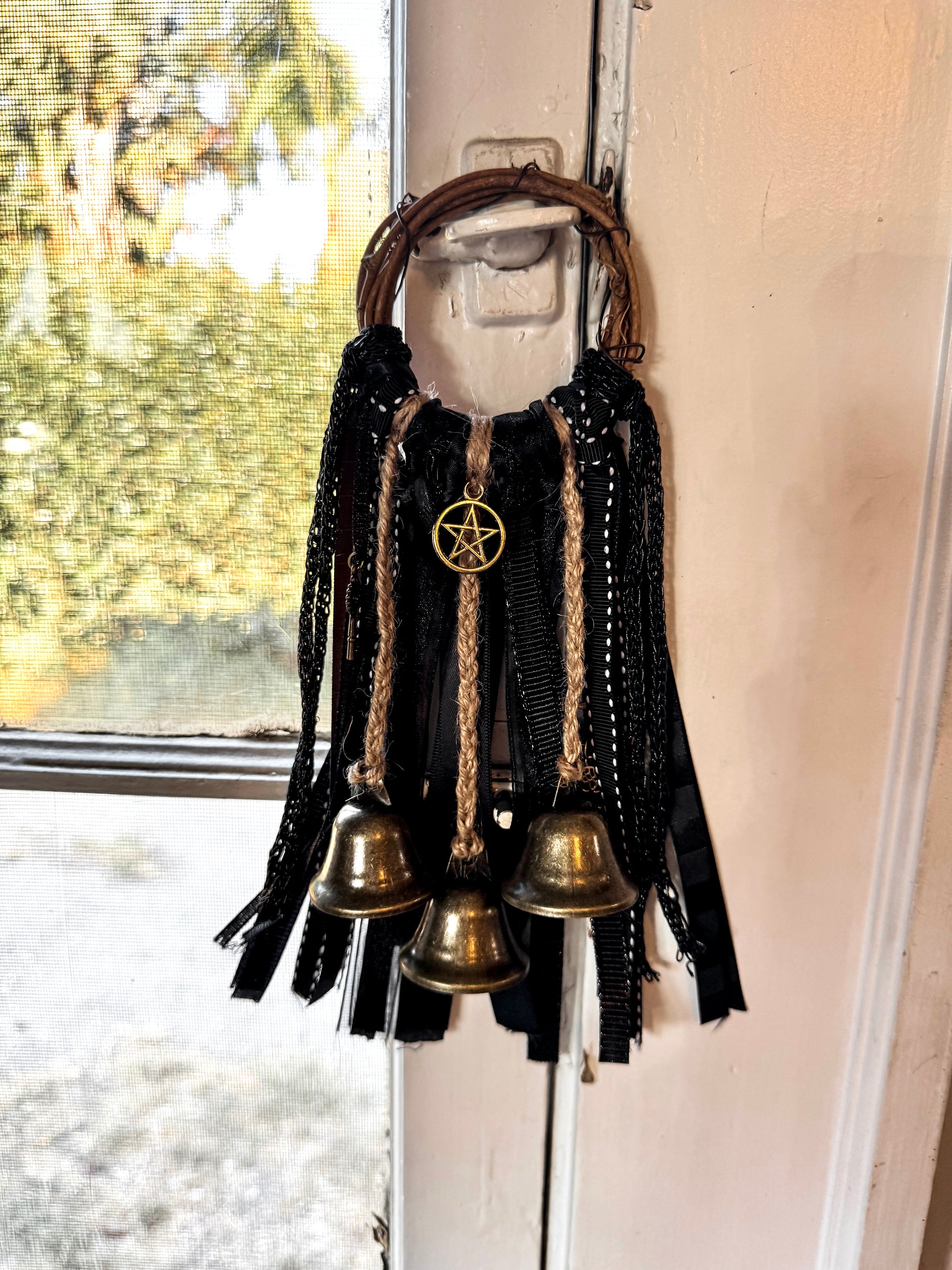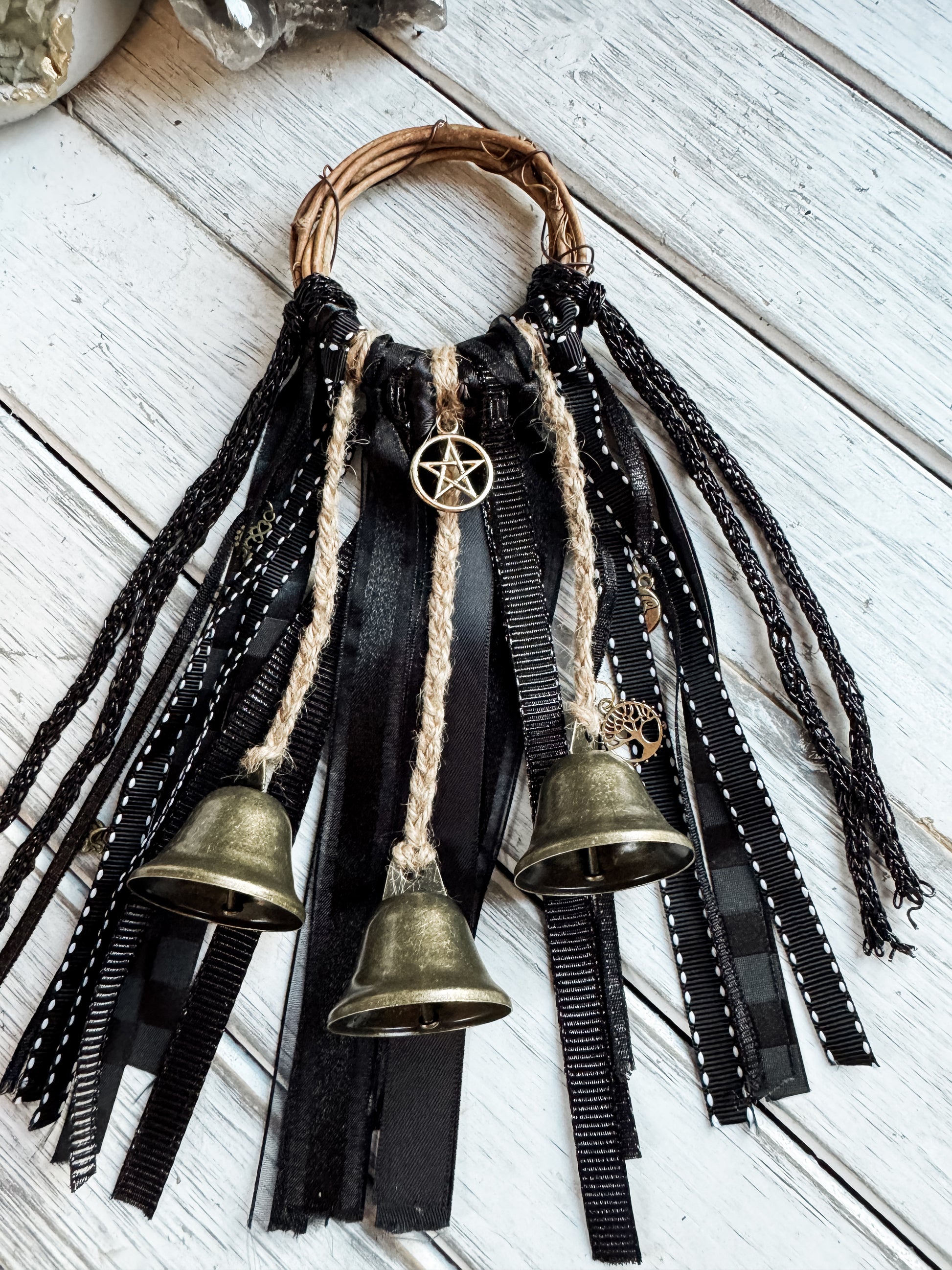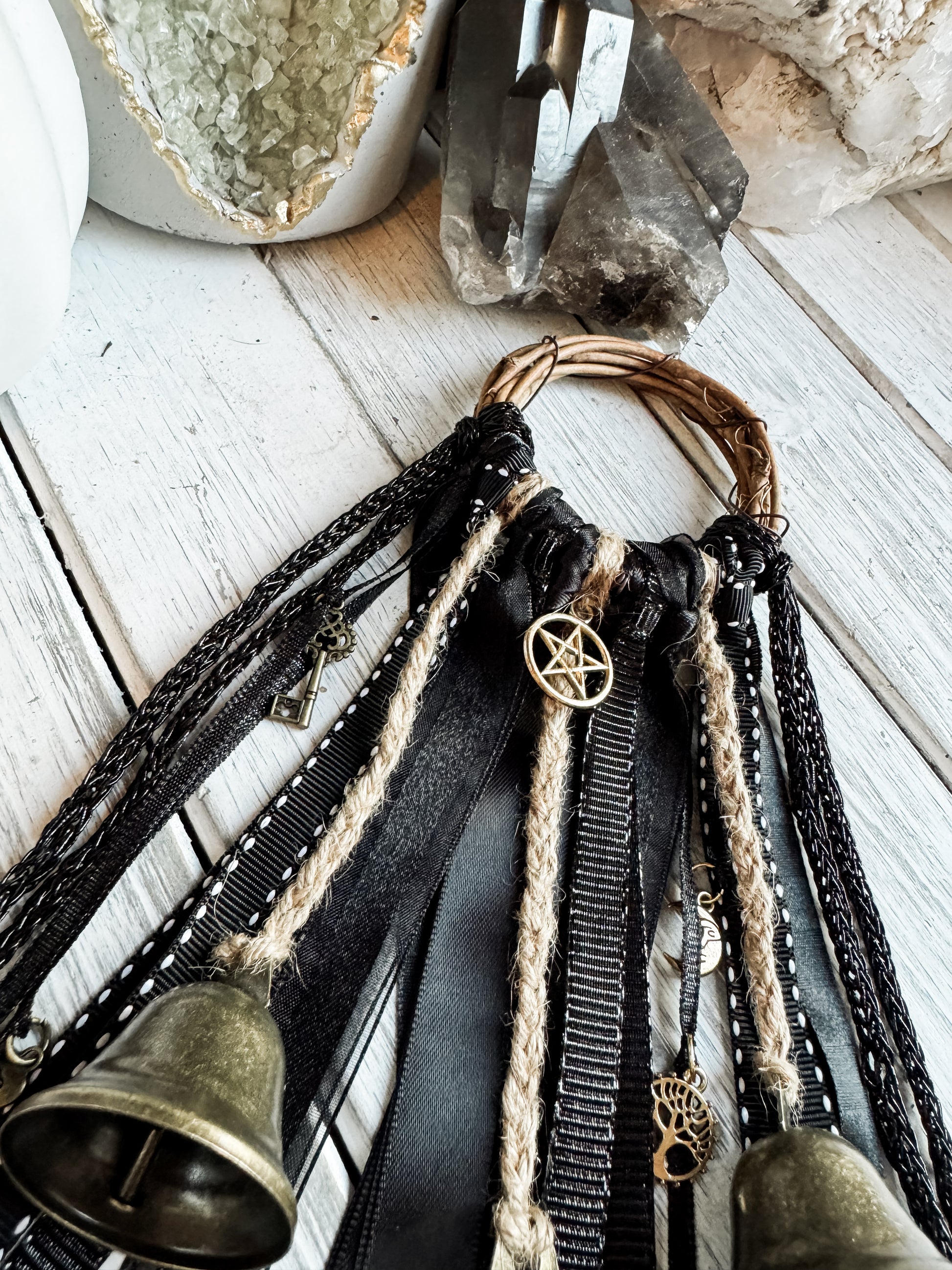 Wrapped in layers of deep black ribbons with subtle textures and patterns, this witch bell embodies mystery, protection, and strength. The central pentacle charm anchors its energy, while the dark tones create a powerful ward against negativity—perfect for guarding thresholds or amplifying shadow work.