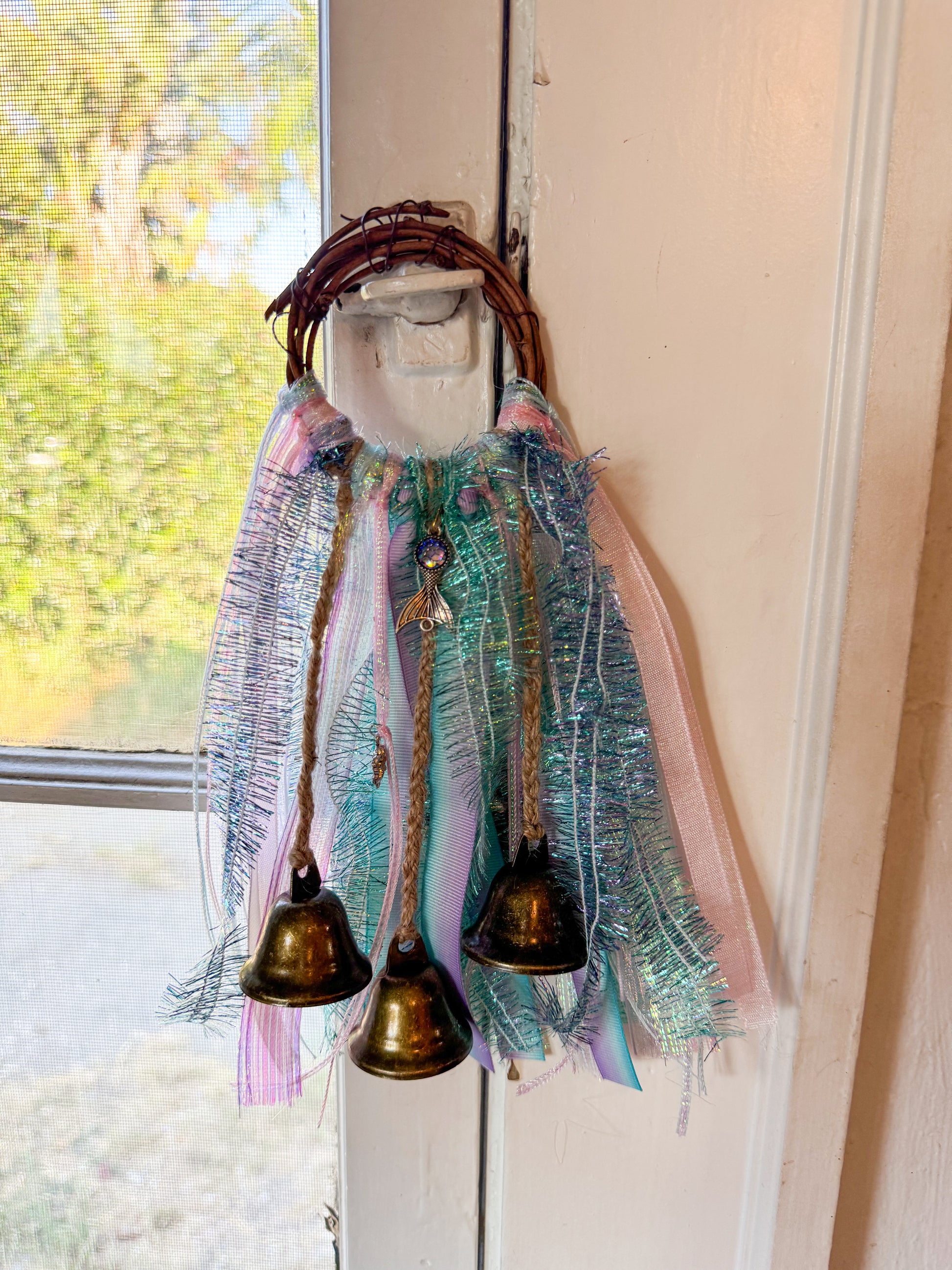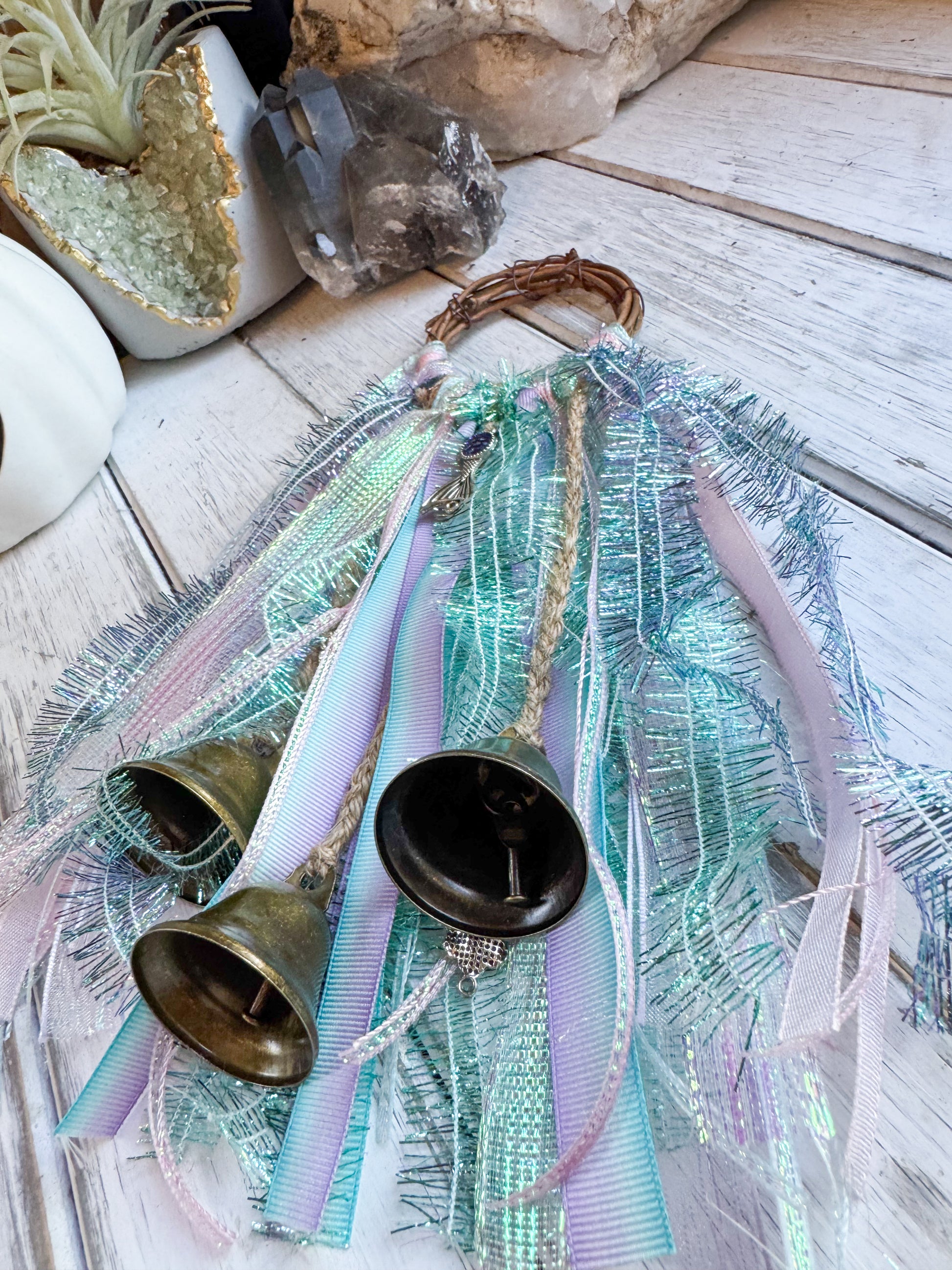 Shimmering aqua, seafoam, and iridescent ribbons ripple like ocean waves, accented with a mermaid tail charm to call in the magic of the sea. This witch bell channels protection, intuition, and fluidity—perfect for those drawn to water’s mysterious depths.