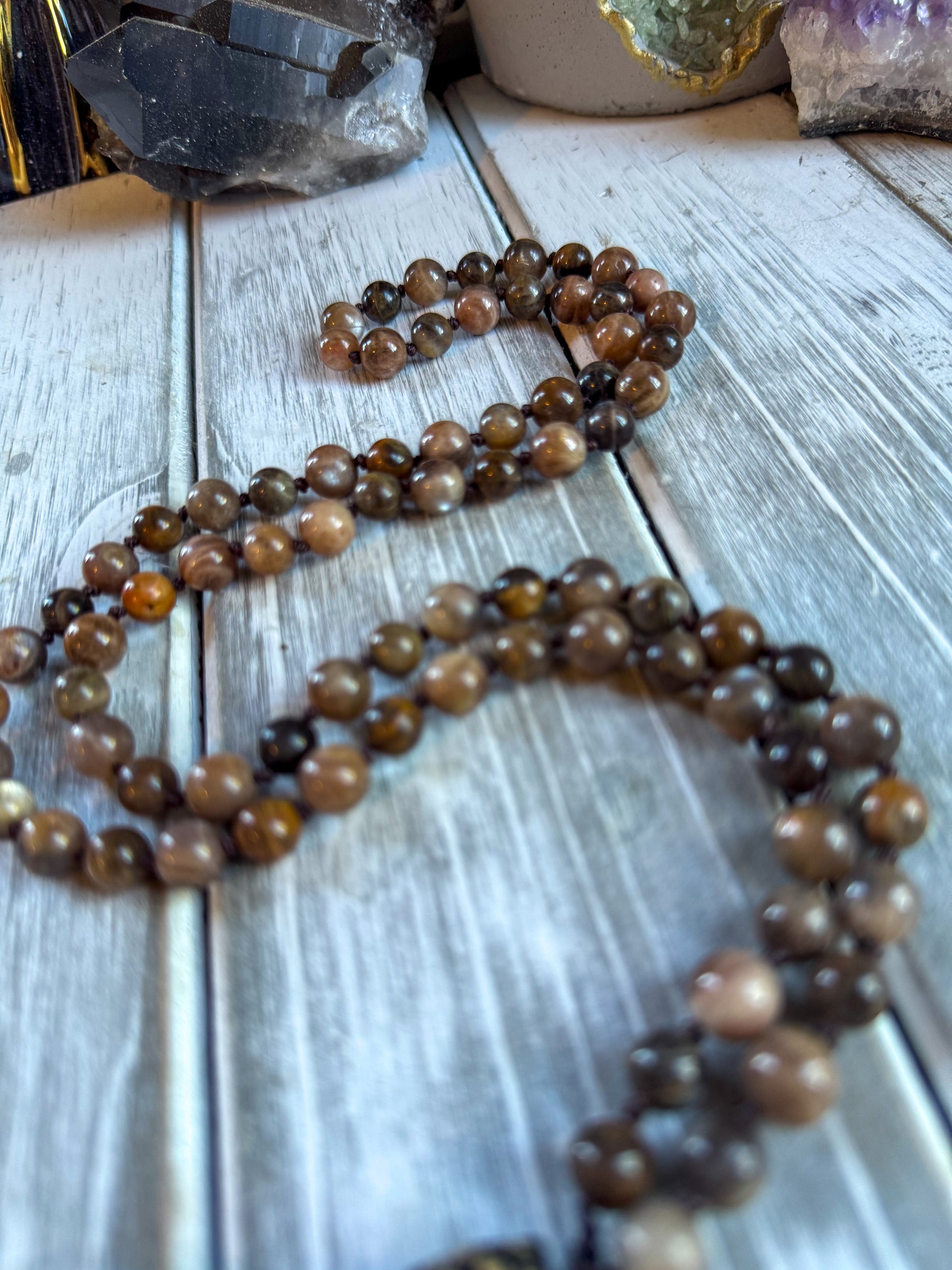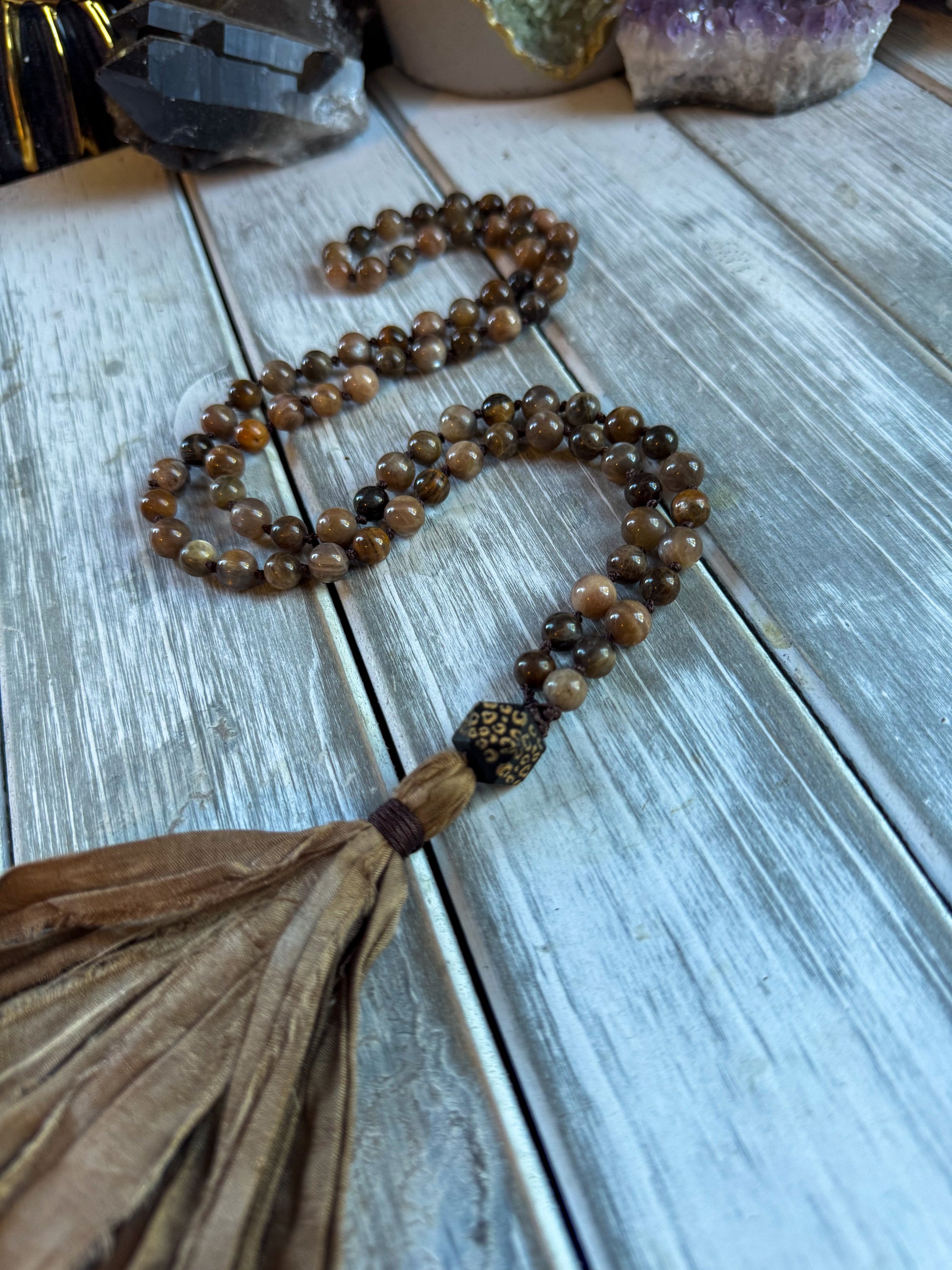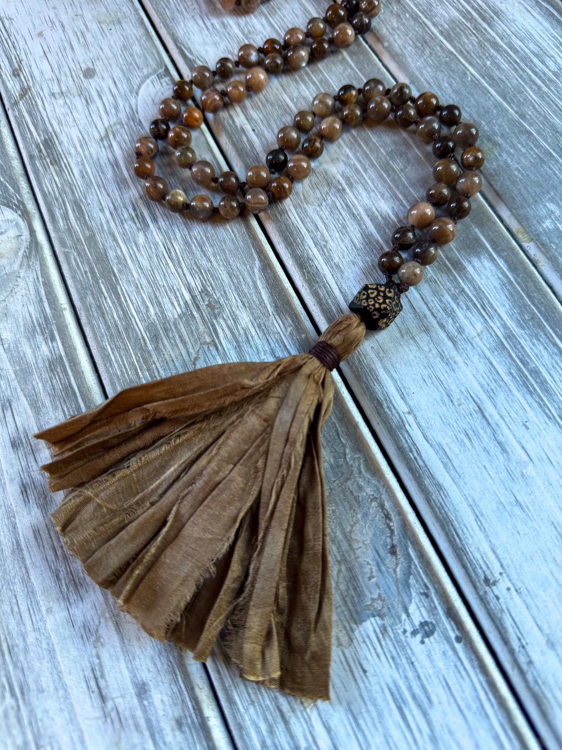 Materials: Handmade with genuine Black Sunstone and Orange-Black Sunstone beads, finished with a bronze sari silk tassel and carved accent bead.