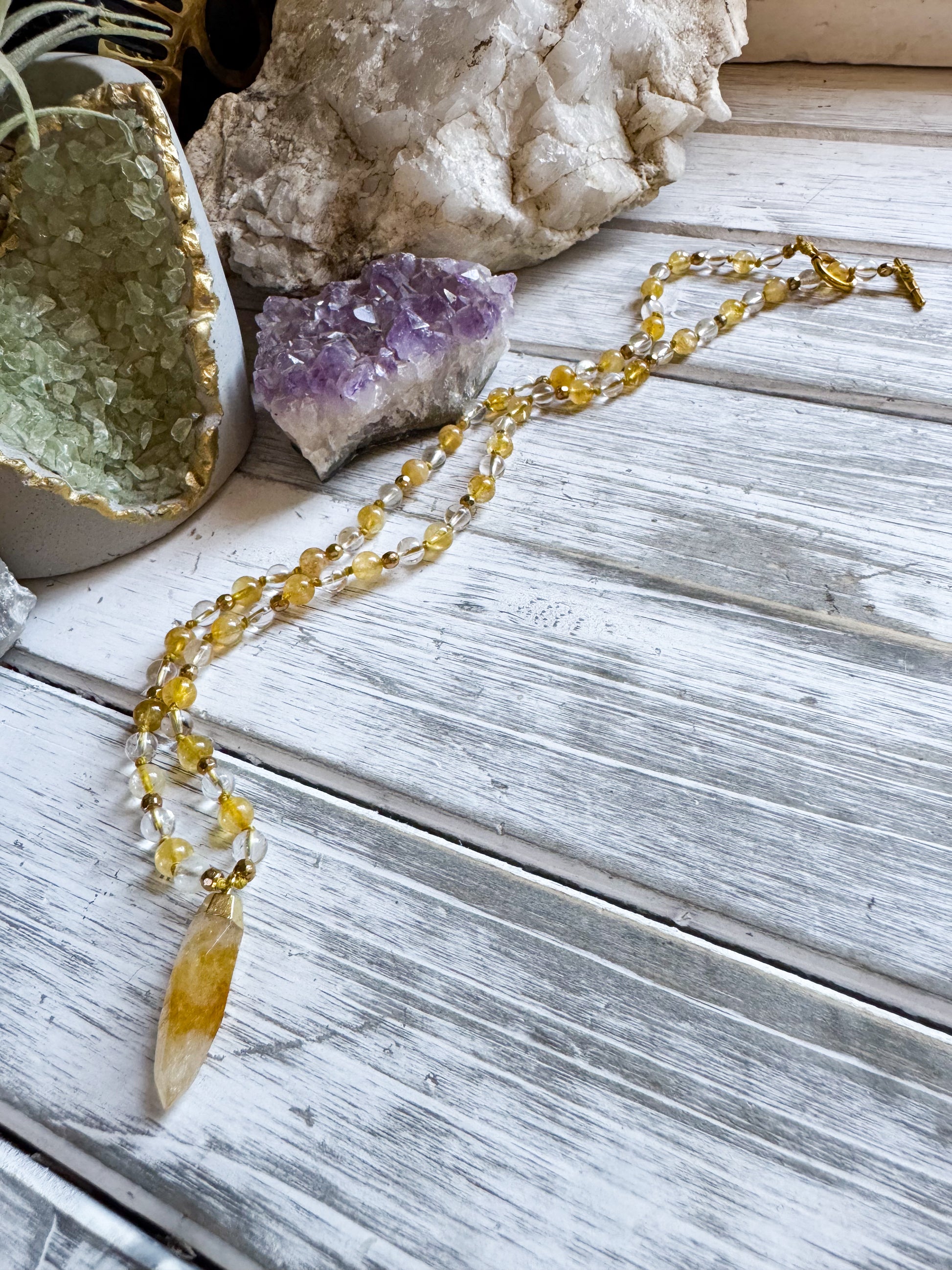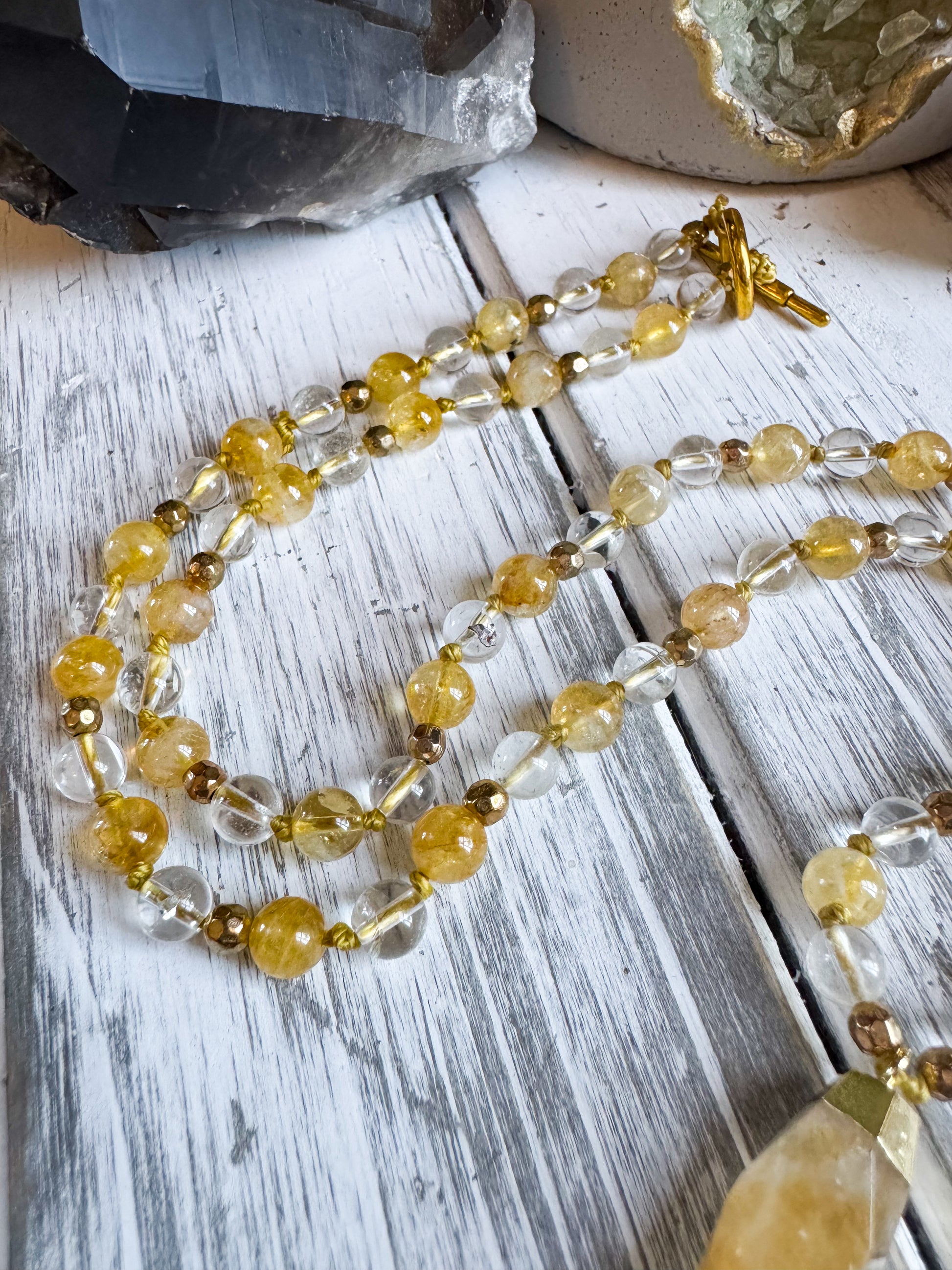 Materials: Handmade with genuine Citrine and Clear Quartz beads, featuring a raw Citrine point pendant.