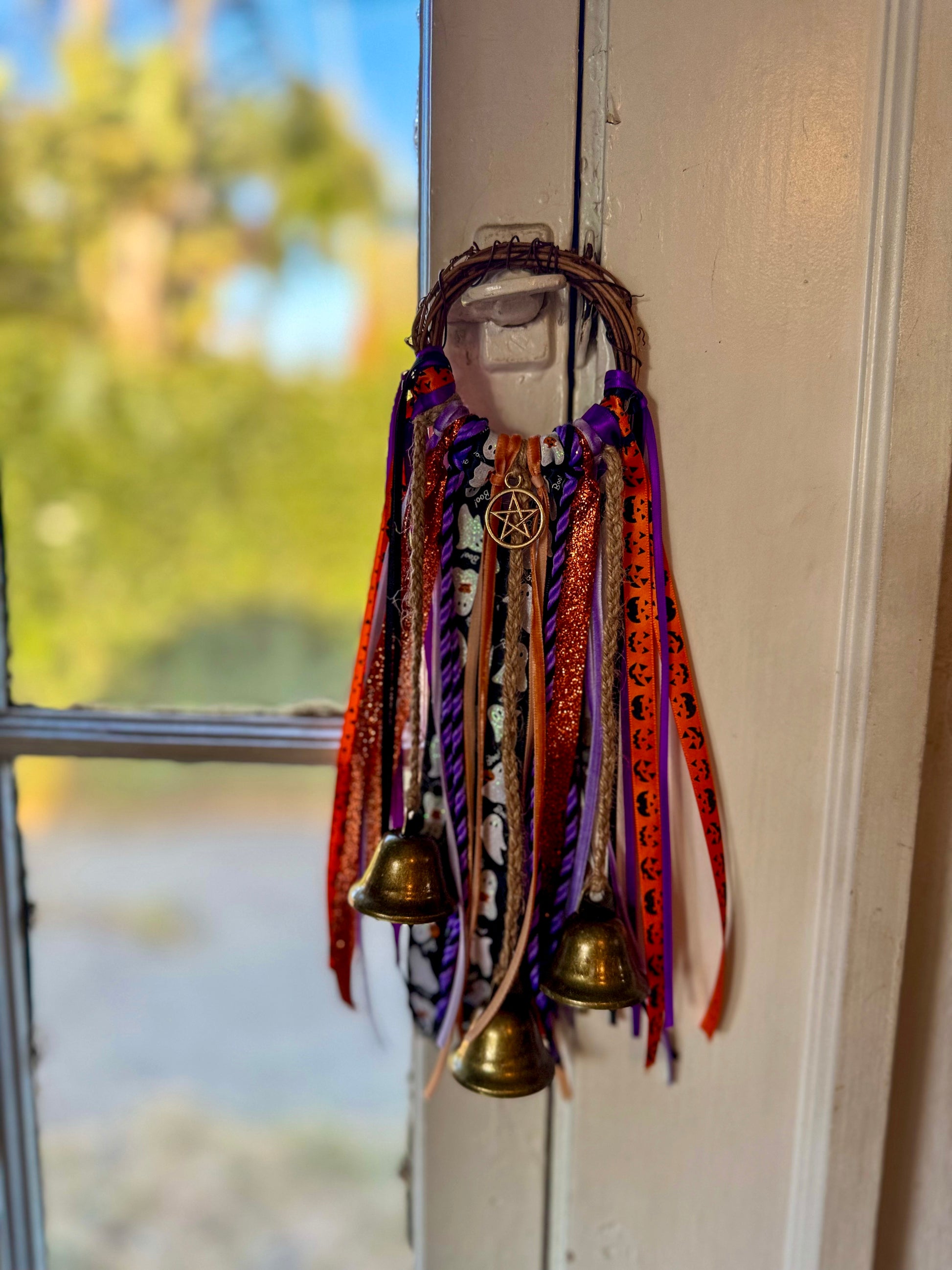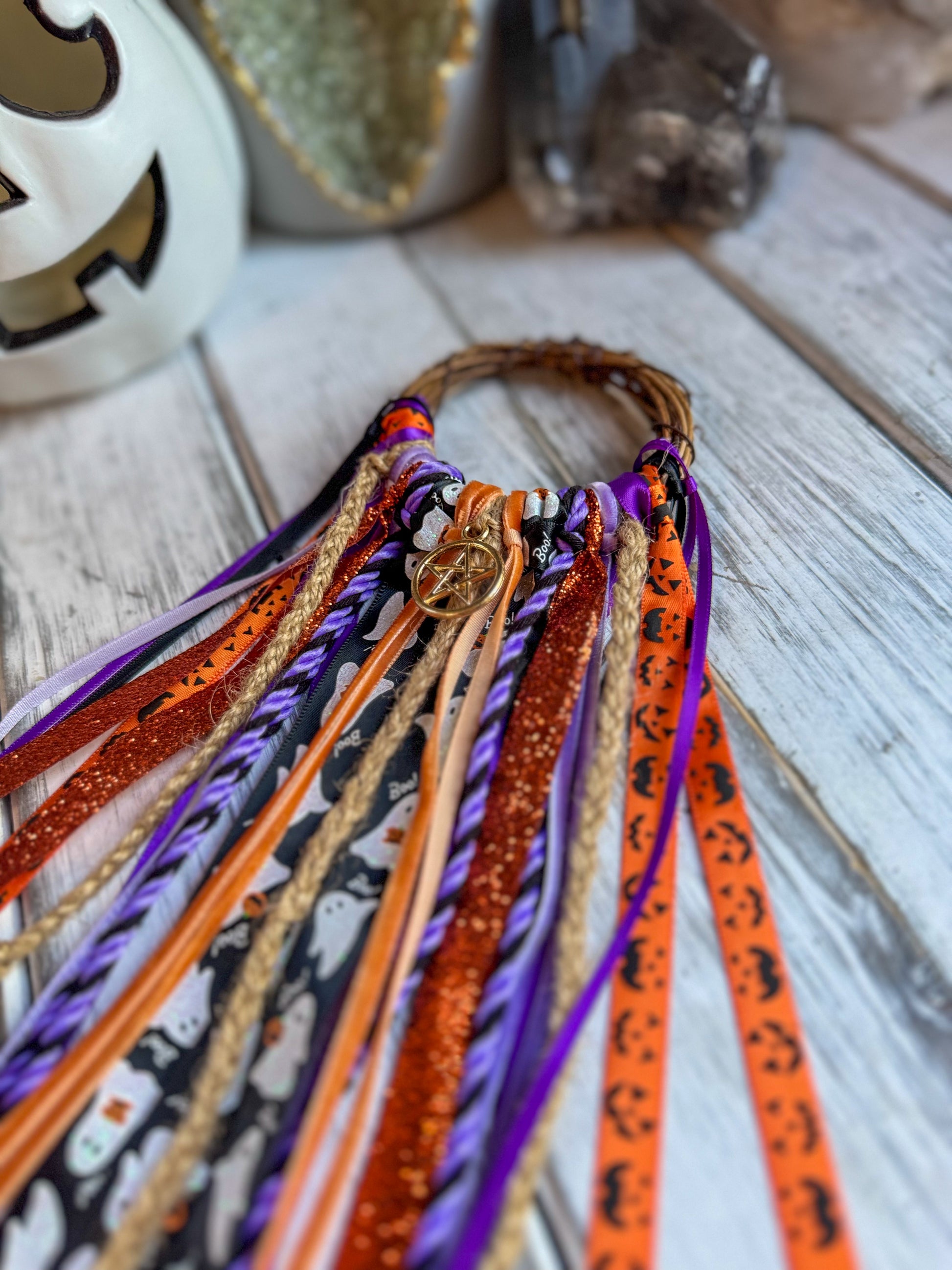 A haunting mix of pumpkin orange, deep purple, and glittering black ribbons frame playful ghost and jack-o’-lantern patterns. The golden pentacle seals it with protection, making this the ultimate spooky-season charm to ward off negativity and welcome festive magic.