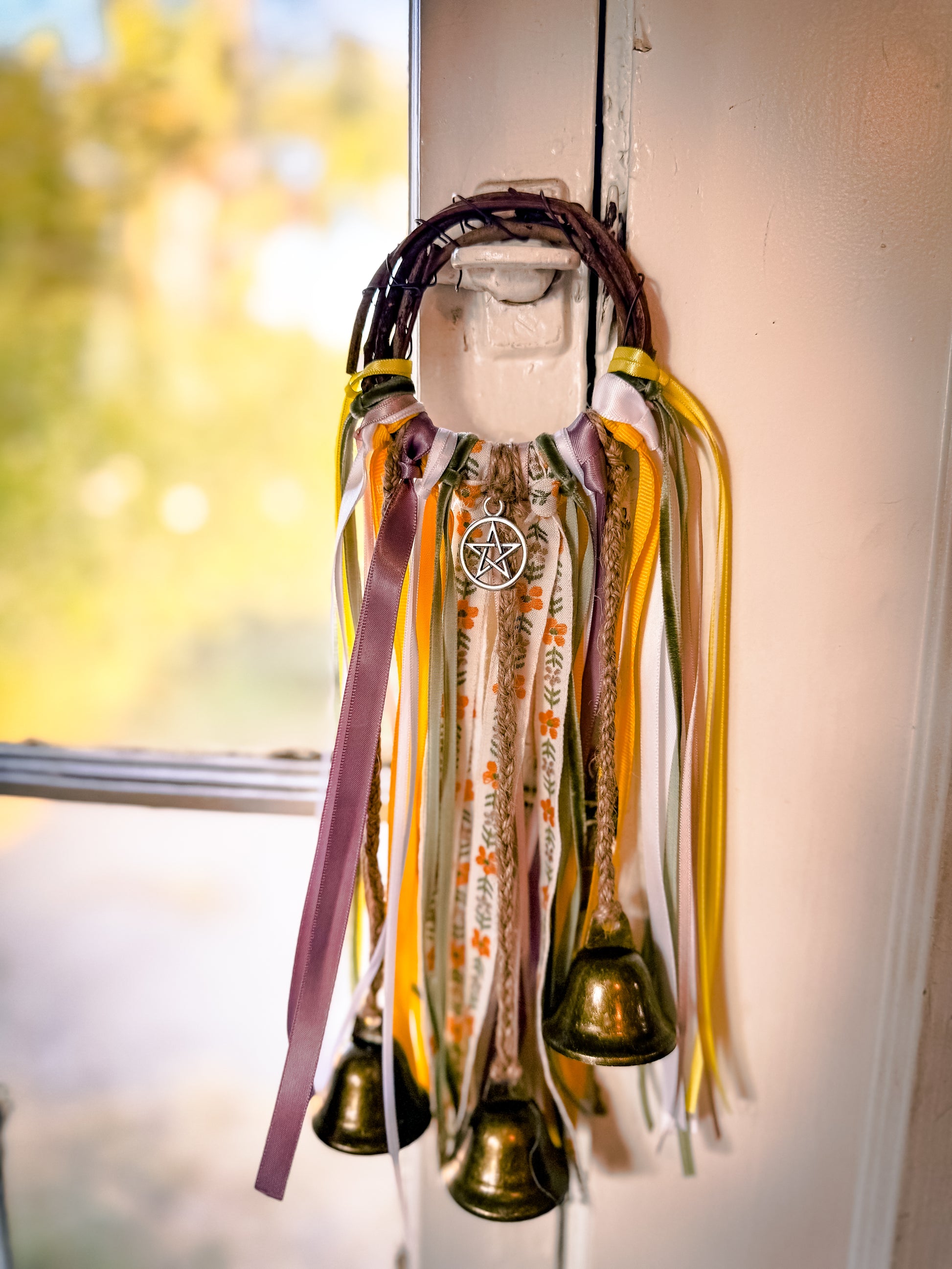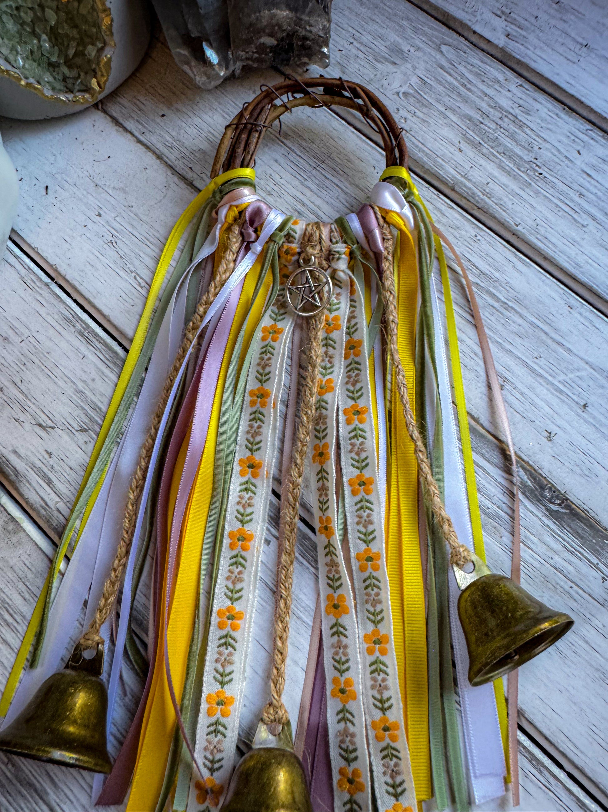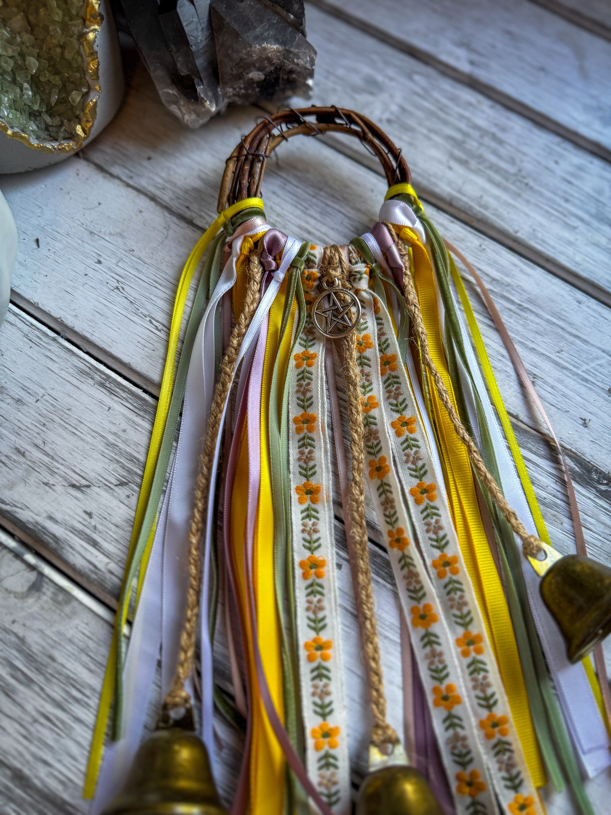 Golden yellows, soft greens, and floral embroidery weave together to create a piece bursting with warmth and joy. Centered with a golden pentacle, this witch bell radiates positivity, protection, and the uplifting energy of a perfect summer day.