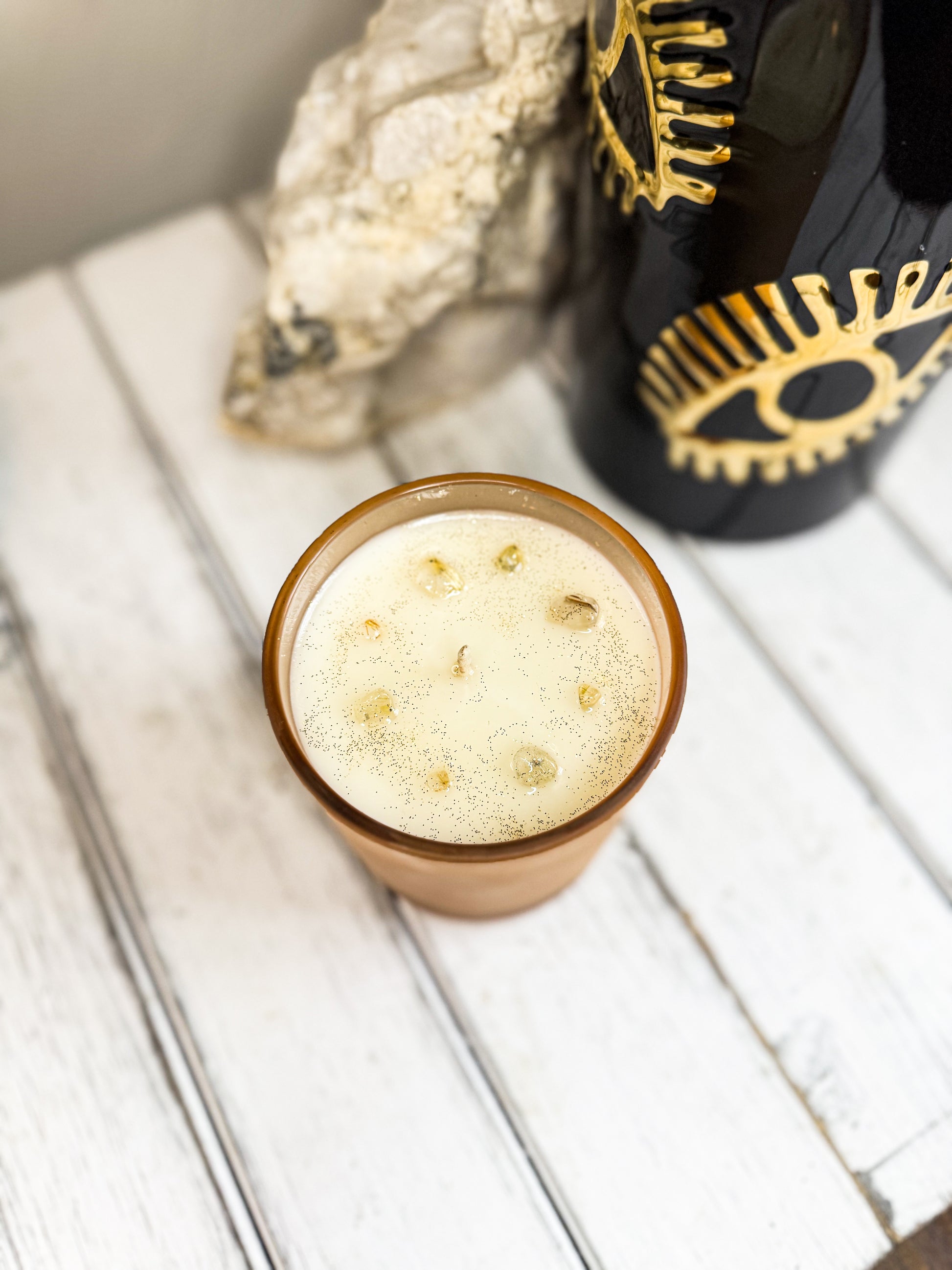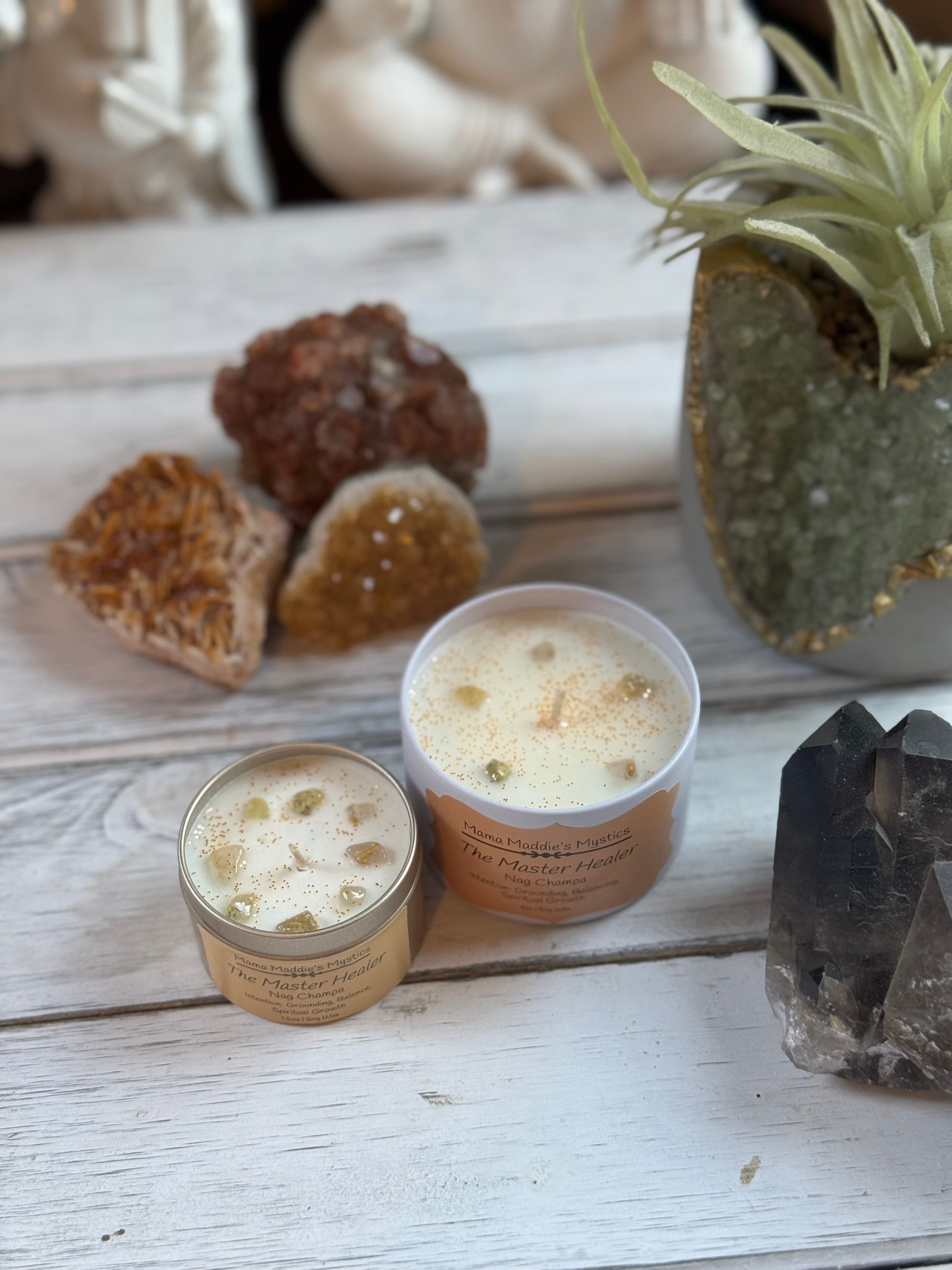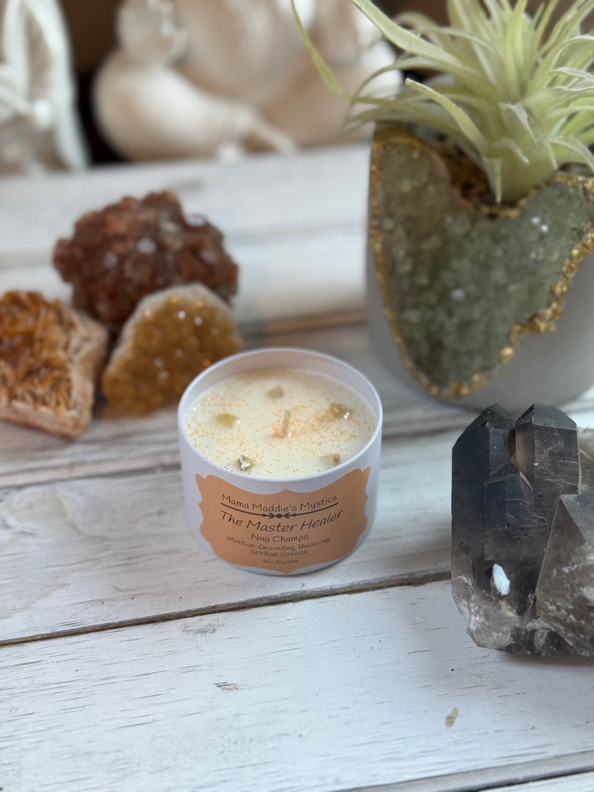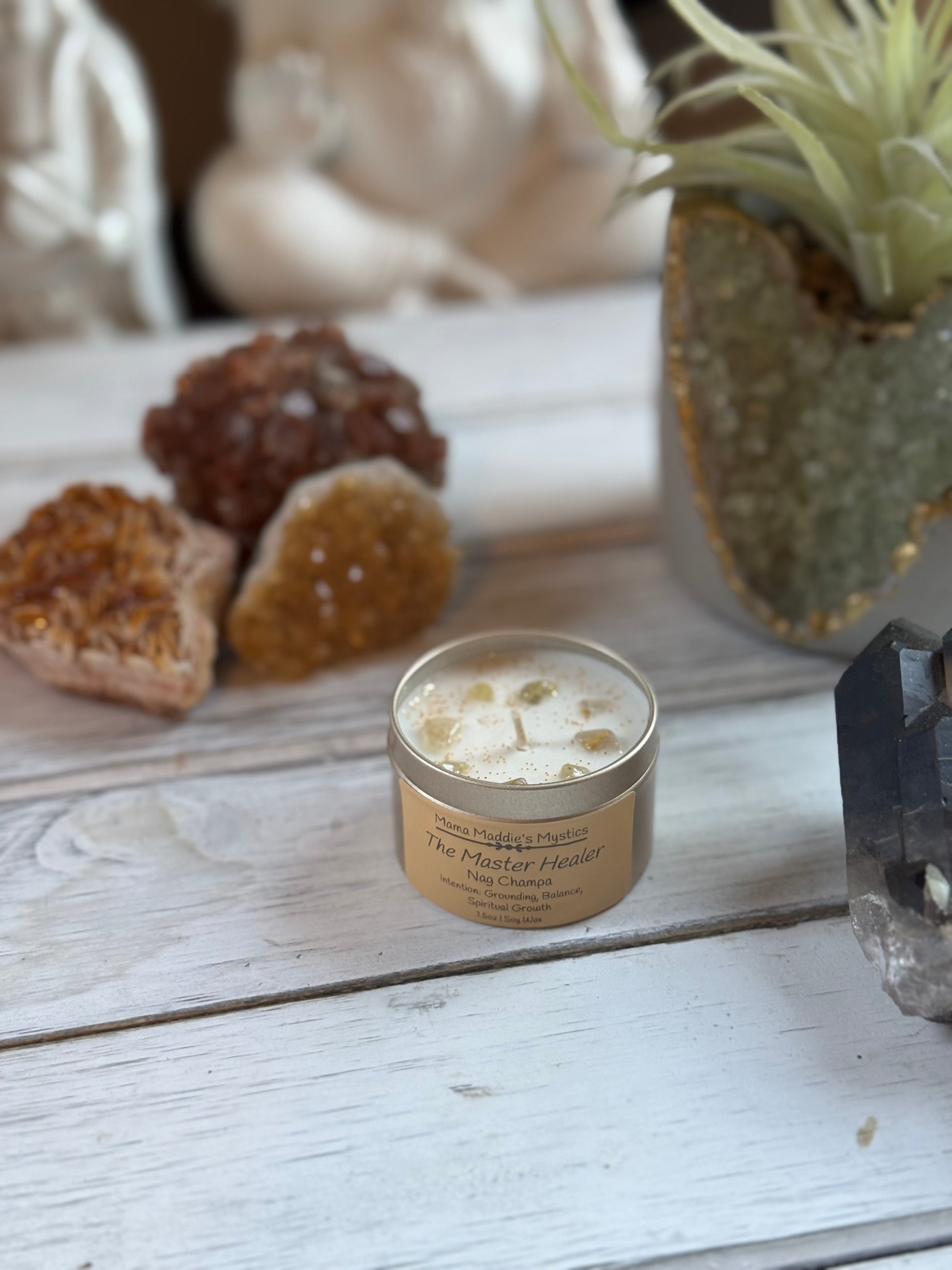 Nag Champa - A lush woody and earthly, yet floral healing aroma that evokes senses of relaxation, positivity and calm. Nag Champa is soothing for the body, mind and soul. It’s known for its calming effect and deeply spiritual association. For those who want to calm the mind, reconnect to their inner path, and enhance their meditative practice, burning this candle will bring bliss to the room. Perfect for those craving balance, peace, and deeper connection.